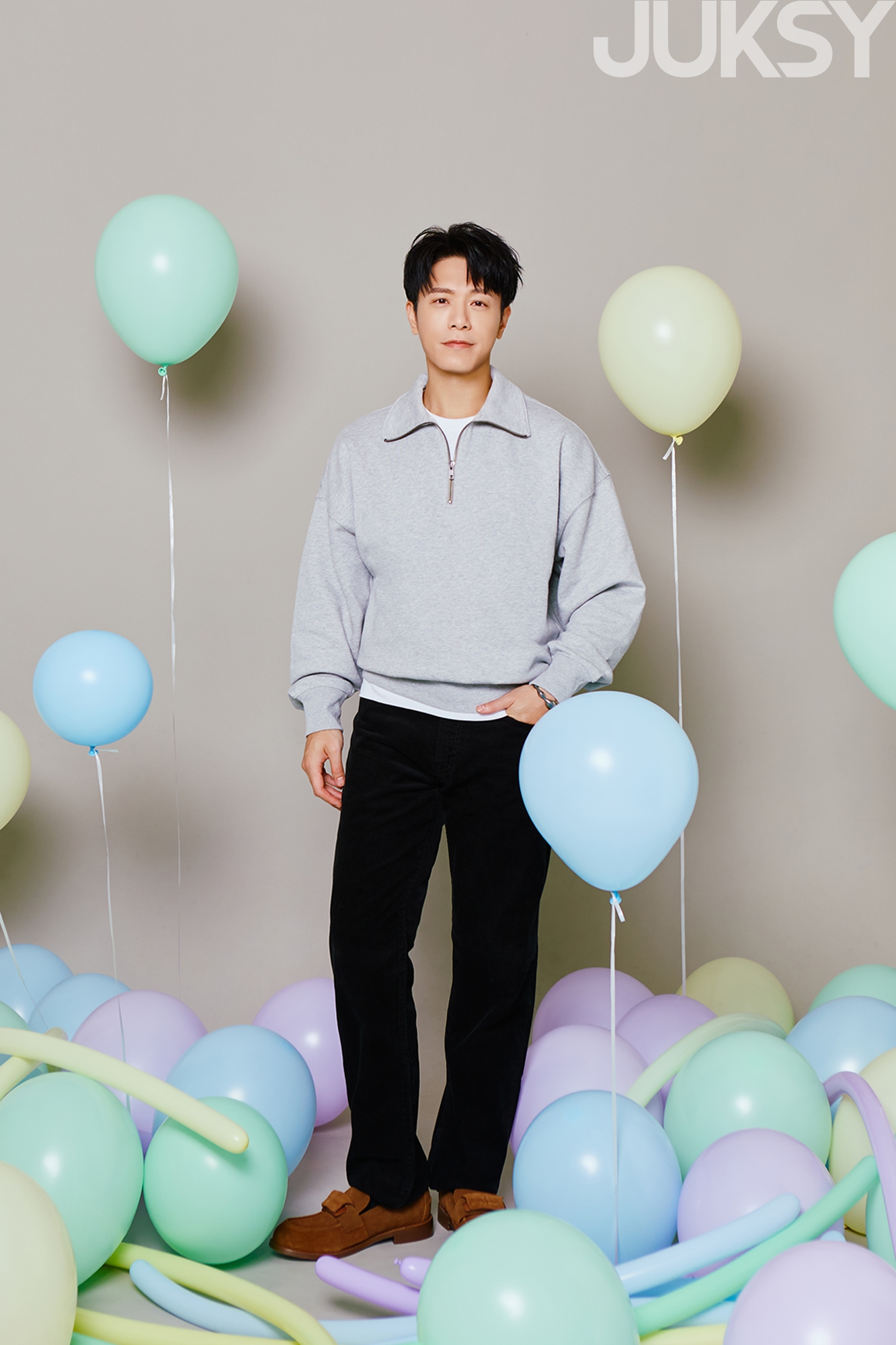 氣球懸在半空,象徵自由與無限可能。韋禮安以淺灰半開襟上衣搭配黑色燈芯絨長褲,展現乾淨俐落的極簡層次。上身的半開襟設計兼具運動與文青感,微鬆版型讓整體線條自然延伸,散發不費力的隨性氣息。下身的燈芯絨材質長褲則在低調中保持質感,透出溫潤的光澤,這樣的穿搭就像他的音樂,懂得留白、懂得呼吸,在節奏與沉默之間,找到屬於自己的平衡。