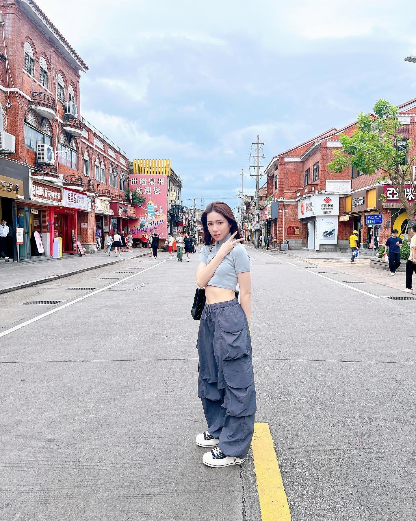 其實,犬青的腿部比例整體而言略偏微肉,但她非常擅長運用喇叭剪裁的褲型,巧妙打造出修長筆直的美腿線條,喇叭褲自大腿處一路延伸至腳踝的漸寬設計,不僅能修飾腿型,還能在視覺上營造出筆直效果,若搭配厚底鞋,更具「增高」效果,是嬌小女孩衣櫃中絕對不可或缺的實穿單品!可以參考犬青以淺灰色喇叭褲搭配短版外套的穿搭,運用「上短下長」的比例技巧,讓整體身形看起來更加修長纖瘦,她也常以白色襯衫與米白色毛衣,搭配同色系的喇叭長褲,穿出柔和優雅的氣質風格。