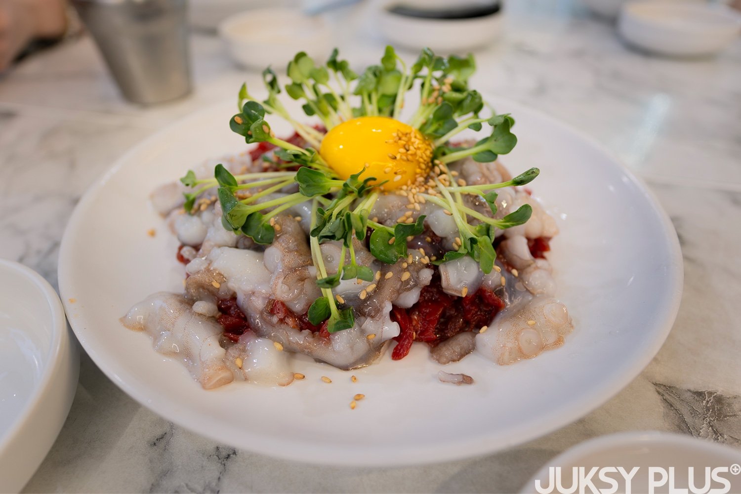 到了首爾想要品嚐最道地、傳統的小吃,廣藏市場是多數人的選擇,包括生章魚、生牛肉、綠豆煎餅、辣炒年糕、韓式刀削麵等,此次編輯實地探訪名店「昌信生拌牛肉」,來上一份生牛肉拌章魚,店家會現撈新鮮章魚,切塊後與生牛肉絲、水梨塊拌在一起,上桌時章魚還會持續扭動,入口後可以吃到牛肉的肉香以及章魚的鮮味,加上水梨的清甜,不過因為生章魚的食感較為特殊,大家可以評估一下自己喜不喜歡!