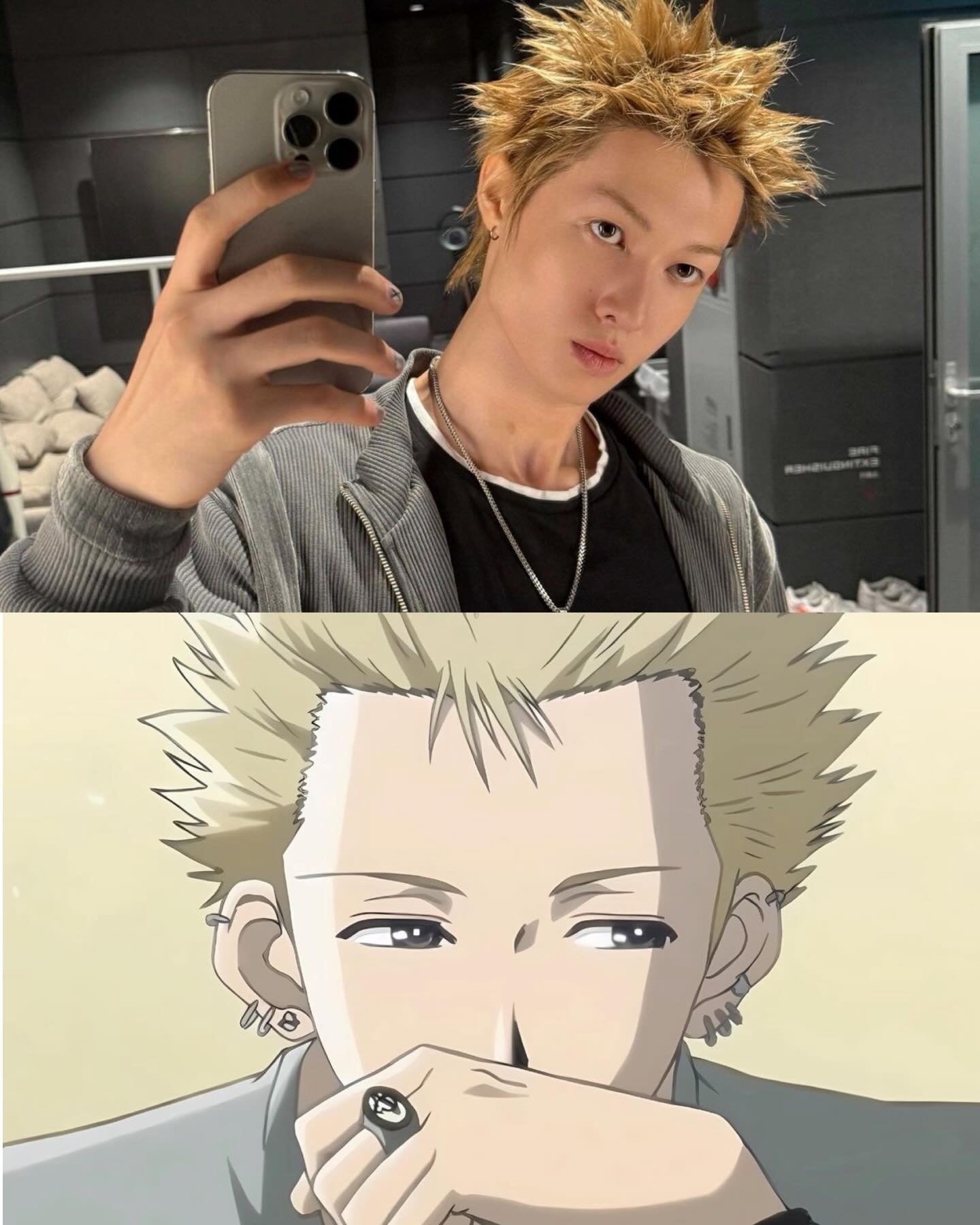 團隊中的人氣人物朴宇宙(Martin),他的「刺蝟頭」直接勾起許多人對日本的印象,有不少網友表示這個髮型很像《NANA》漫畫中「寺島伸夫」的髮型。這種造型強調立體層次與空間感,關鍵在於打薄的功力。頭髮經過細緻修剪後,再利用定型品將髮束一根根立起來,營造叛逆卻帥氣的效果。金色的染髮更突顯了他的白皙膚色。這款髮型推薦給喜歡日系穿搭、或想要展現個性張力的人。