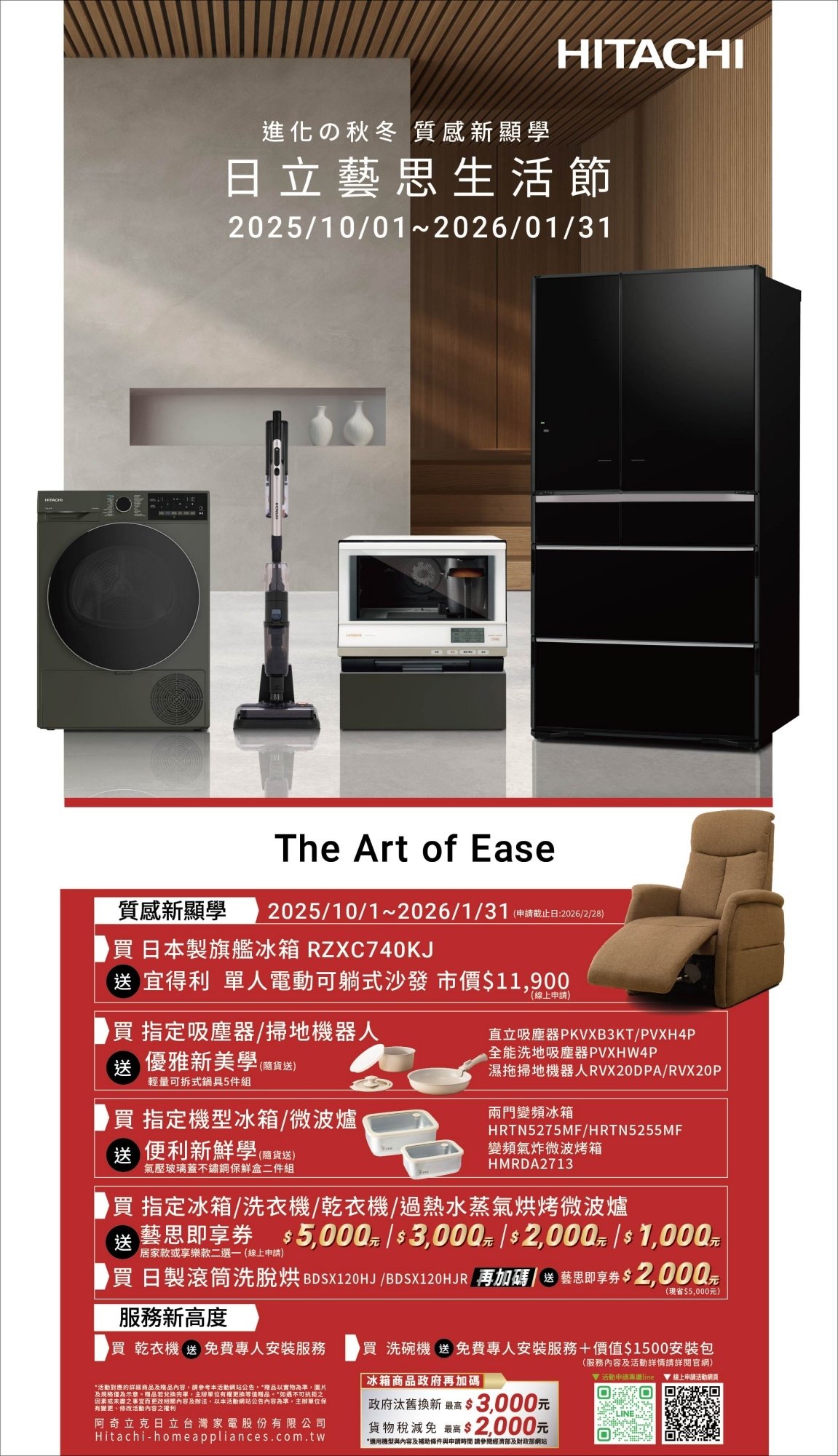 秋冬家電最強檔,比周年慶更優惠的「日立藝思生活節」年末優惠再推出!即日起至2026年1月31日,購買指定日立家電最高可省7,000元(含政府貨物稅減免),還有萬元電動沙發、5,000元即享券、質感廚具組等好禮大方送,超多優惠回饋,買越多越划算!其中網路熱銷、可濕拖、極輕勁吸的全能洗地吸塵器 PVXHW4P也在優惠之列!日立以最完整的換季優惠,陪伴消費者打造秋冬質感新生活。