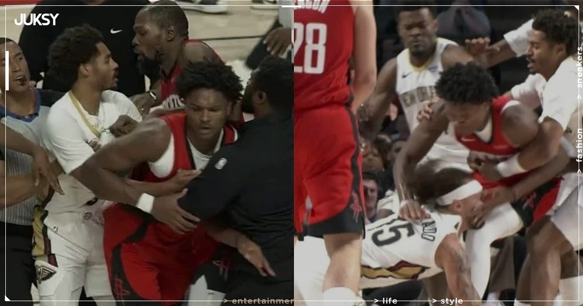 這場比賽進行至第二節中段,火箭隊前鋒小史密斯(Jabari Smith Jr.)一次三分球出手沒進,禁區附近的 Amen Thompson 與 Jose Alvarado 在爭搶籃板球的過程中產生推擠,結果後續演變成肢體衝突,只見 Alvarado 直接把 Thompson 拉倒,而 Thompson 則是在落地時大力推擠對方,兩人火氣上來一度要正面交鋒,最終一旁隊友很快將他們各自架開。