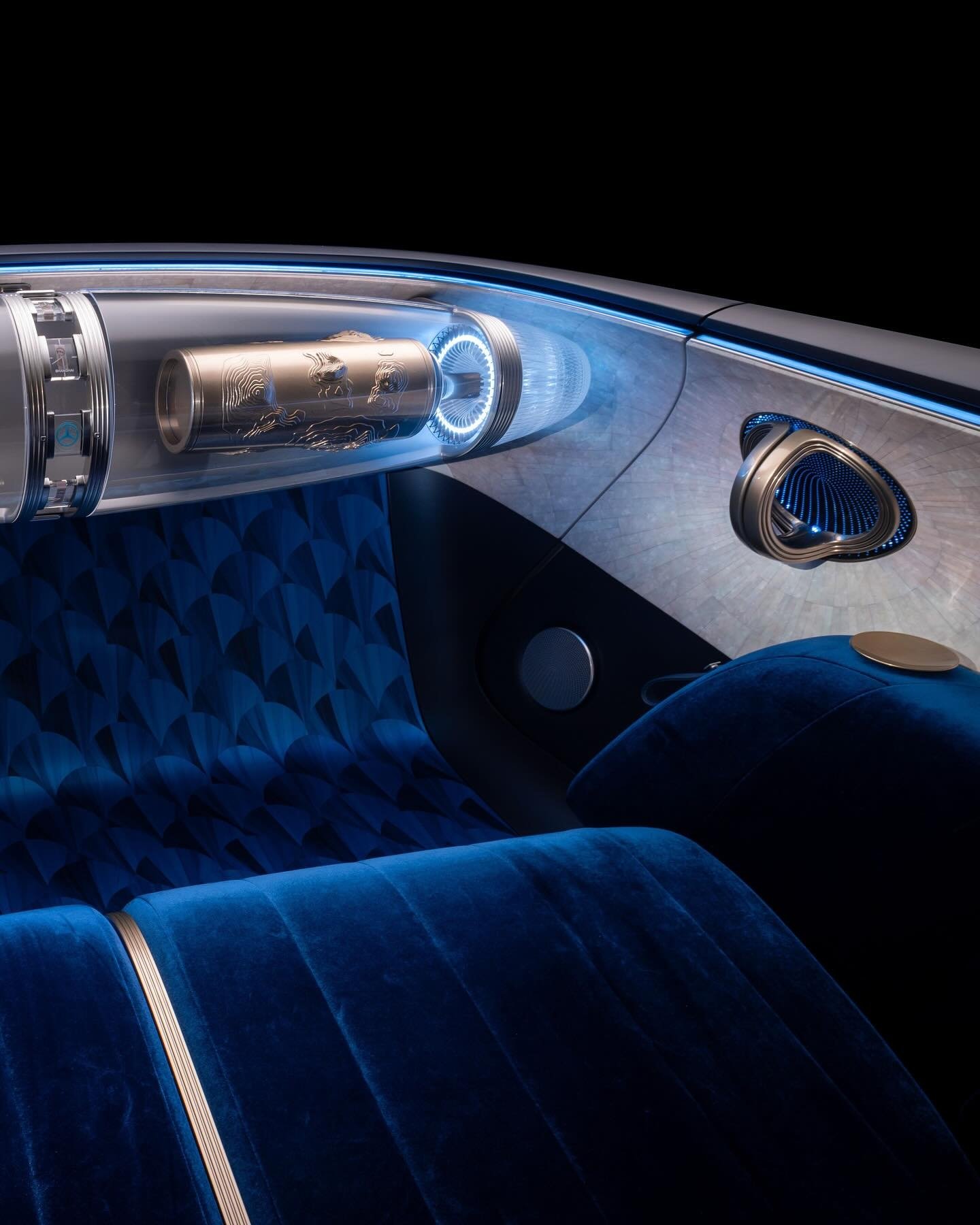 內裝採用藍銀雙色調,四輻式方向盤與沙發式長椅座椅設計,讓人聯想到舊時代的飛艇艙。中控則是懸浮式玻璃儀表板,Mercedes 稱之為「Zeppelin(齊柏林飛艇)」,上面佈滿指針儀錶與鐘錶細節,彷彿一台能穿越時空的藝術機械。