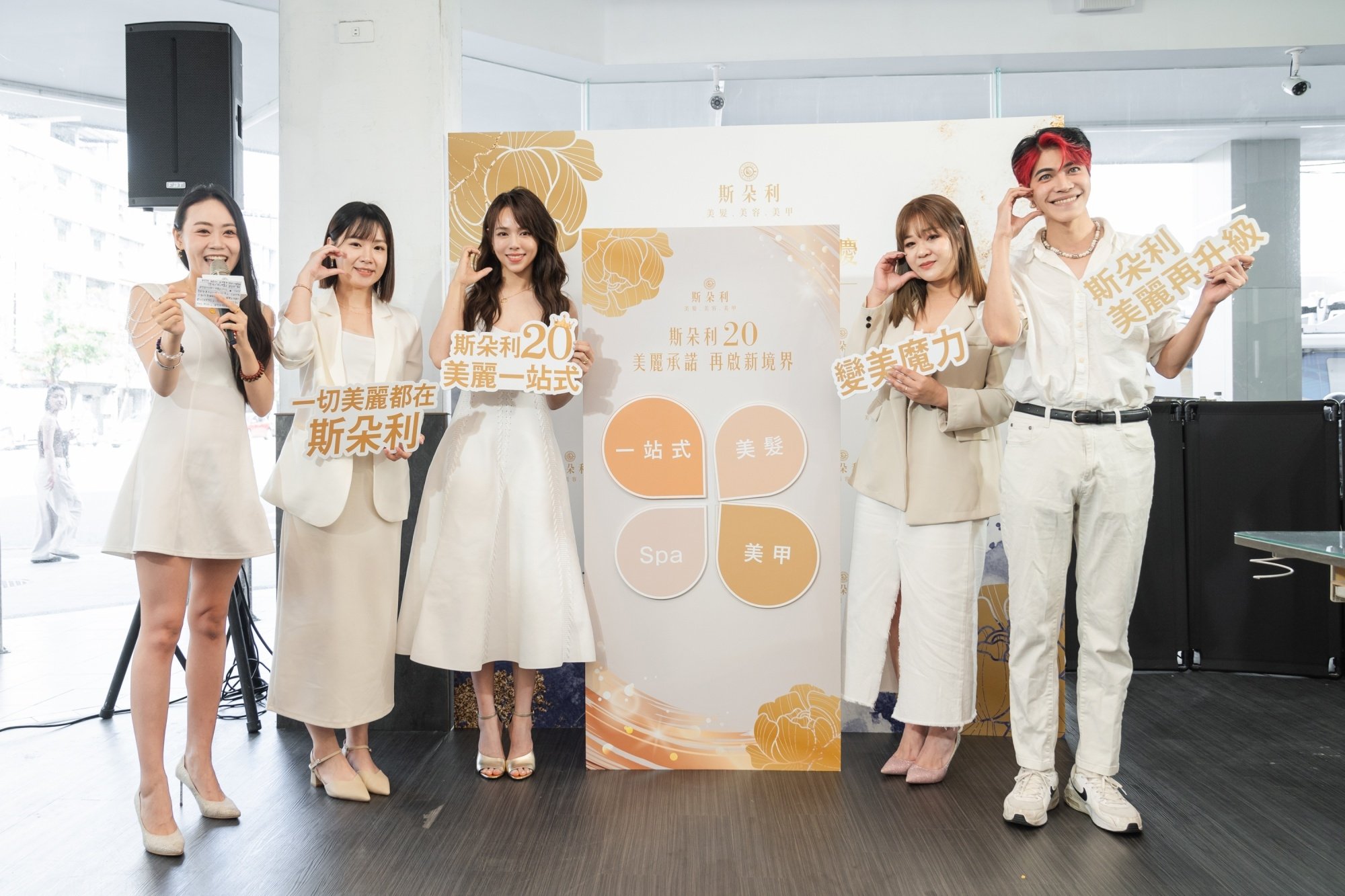 - 共同見證斯朵利美麗再升級啟動儀式。(由左至右)美容部貝貝經理、斯朵利髮廊代言人夏于喬、美甲部Yoyo經理、美髮部威廉經