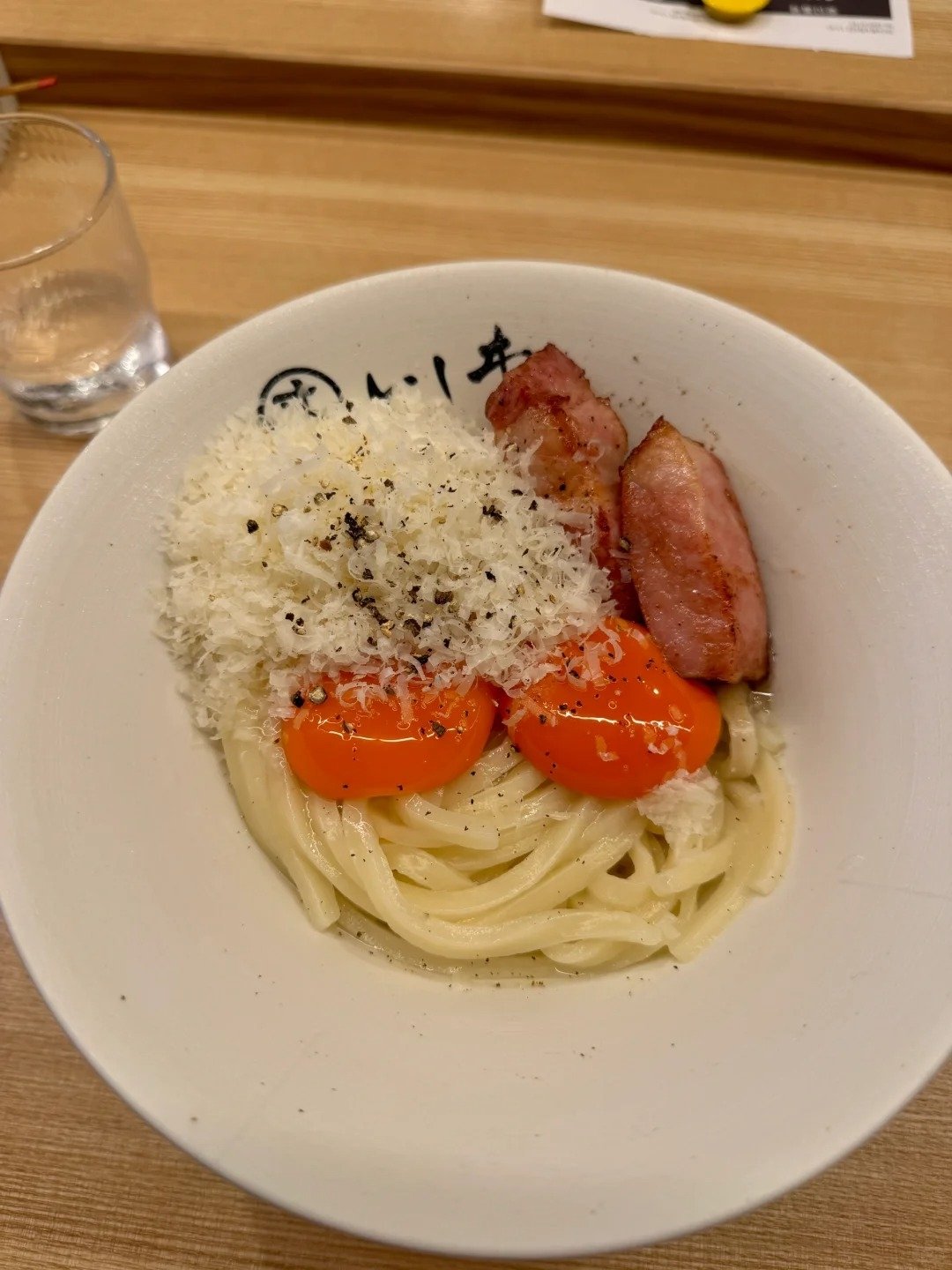 「麺屋 いしヰ」烏龍麵每日限量 100 碗,而且只在中午營業,想吃就得早點出發!這次點了招牌的明太子黃油烏龍麵和培根奶油烏龍麵,店家自製的烏冬麵口感超 Q 彈,調味也相當濃郁,每一口都滿滿香氣。強烈推薦一定要單點炸物,像是炸蝦、溏心蛋,尤其是雞胸肉天婦羅,嫩而入味,完全顛覆對雞胸肉的印象,第一次吃到這麼好吃的雞肉天婦羅,絕對會讓人回味再三!