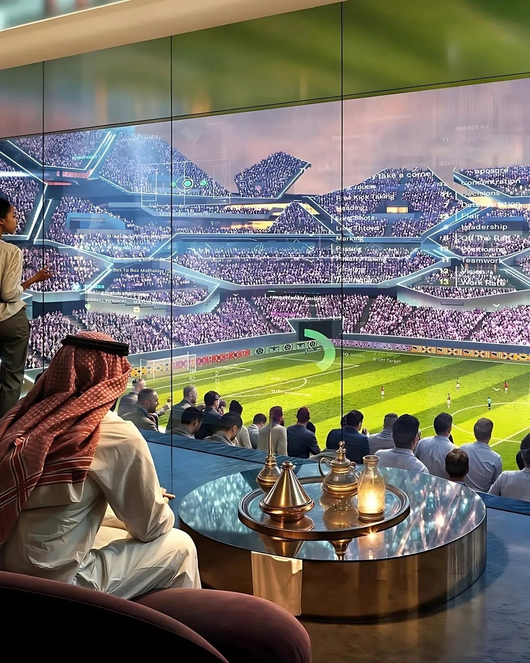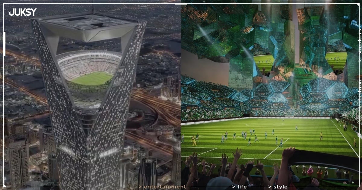 這座天空體育場是沙烏地阿拉伯「未來之城」The Line 計畫的一份子,場館座落於城市的垂直中軸,計畫於 2027 年動工建設,並在 2032 年完工,比 2034 年世界盃還要提前兩年。規格方面,整體可容納 46,000 名觀眾,以銳利的幾何線條、鏡面反射和與周圍景觀融為一體的 LED 照明元素為特色,屋頂呈現出破碎的質感,如同玻璃碎片懸浮在球場上方,從各個角度看都極具視覺衝擊力;觀眾席採用蜂巢式佈局,旨在最大限度地提升視野和音響效果。