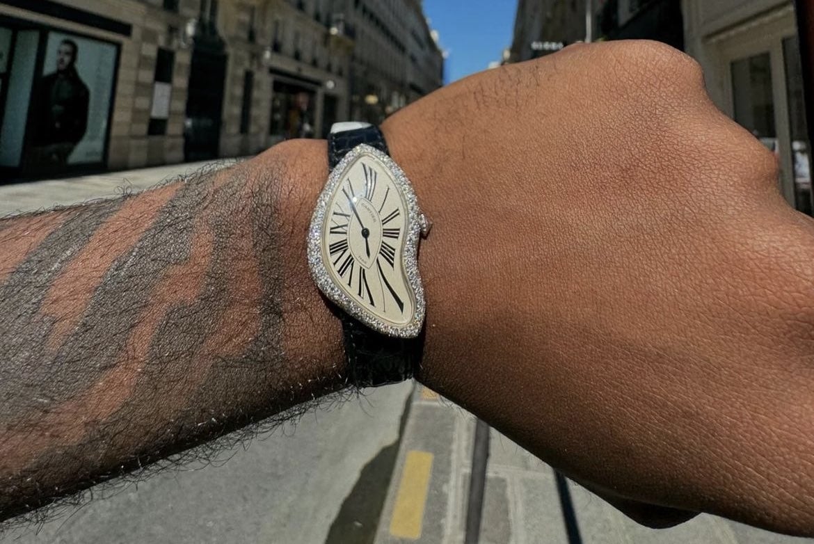 晚餐時刻的他則換上經典的 Cartier Crash Paris,這款錶以扭曲的錶殼線條著稱,是 Cartier 最具收藏價值的錶款之一。而 Kai 的這款 Cartier Crash Paris 甚至邊邊還有許多鑲鑽,把它與身上的黑色 T-shirt 搭出之後顯露出極簡的貴氣,妥妥是懂玩細節的富有男人味。