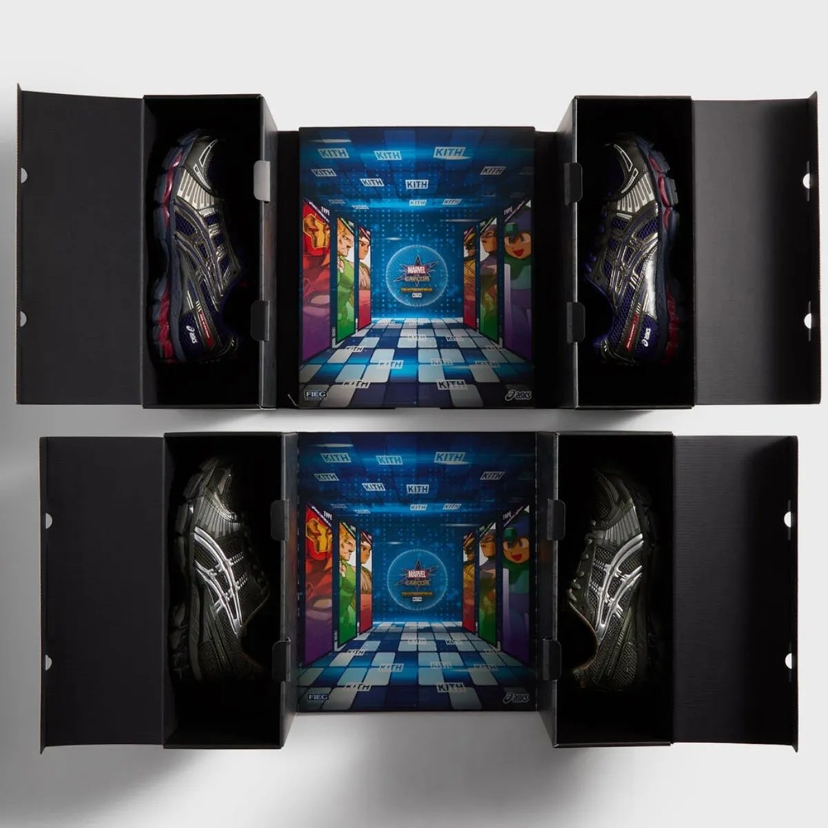 此番 Kith x《Marvel vs. Capcom》x ASICS 聯名系列以《Marvel vs. Capcom》復古街機文化為主題,將 Marvel 與 Capcom 的角色完美詮釋於鞋款上,一共有 4 款套裝,其中有兩款是「雙盒形式」,以經典的宿敵對戰組合呈現,像是以「鋼鐵人 vs 洛克人」組合為主題的 GEL-Nimbus 10.1 “Iron Man vs. Mega Man”兩款配色,以及「美國隊長 vs 蓋爾」的 GEL-KAYANO 12.1 “Captain America vs. Guile”。