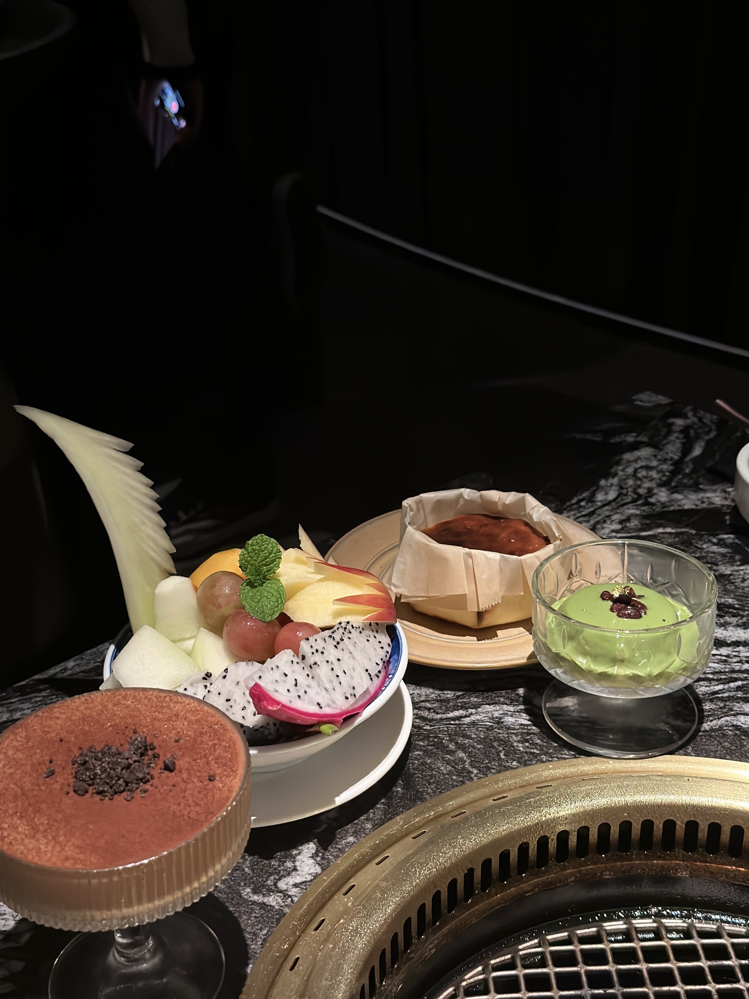 品牌視覺由設計師馮宇操刀,以「火與肉的對話」為靈感,將烤網交織的線條融入設計,形成品牌識別的核心元素。天花板以木條與白色球體構築層次感,牆面以大廈色塊呈現都市肌理,材質與色彩節奏從「綠 → 光 → 黑」營造空間變化,帶出從戶外到室內的情緒轉換;金屬與木質交錯,搭配吧台區的高腳椅與皮沙發,呈現復古摩登感,形成明確的視覺焦點,整體環境兼具現代感與自然細節,給人都市綠洲般的放鬆體驗。餐廳佔地約 100 坪,分為兩層樓,可容納 120 位賓客。一樓為開放式吧台與小型卡座區,適合多人聚會或單人用餐;二樓規劃多間獨立包廂,最大可容納 20 人,兼具隱密與舒適,滿足各種餐敘與社交需求。