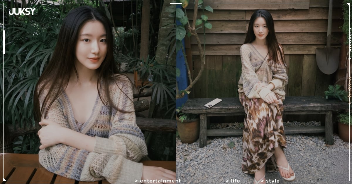 這次清邁之行,舒華的行程相當悠閒,畫面中她在河邊啜飲椰子汁,也漫步於老街與市集,挑選各式小物,最吸睛的莫過於她的旅行造型,穿著一件細肩帶低胸琥珀色花紋長洋裝,搭配寬鬆米色鏤空針織外套,大地色系的組合散發出溫柔又知性的氛圍,而因外套較為寬鬆,舒華行走時偶爾滑落,形成不經意的「小露香肩」效果,呈現自然的露肩風格,她與 Dora 在店內拍照時,還戴上手工編織草帽,整體畫面充滿度假悠閒感。