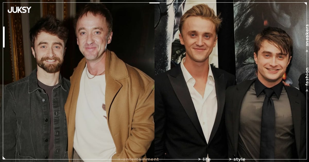 哈利波特迷絕對難忘這對「宿敵組合」再度同框的瞬間。飾演哈利波特的丹尼爾雷德克里夫與飾演跩哥馬份的湯姆費爾頓,日前在紐約哈德遜劇院的「快樂向前行」特映會意外相遇,讓現場粉絲瞬間陷入激動情緒。自從 2001 年《哈利波特:神秘的魔法石》上映,兩人首次以同台形式現身已是 24 年後的事。當年的青少年如今早已成為成熟演員,但彼此間的默契與熟悉感仍然沒有改變。根據現場影片與照片,兩人一見到彼此便露出燦爛笑容,緊緊擁抱,彷彿時間從未流逝。丹尼爾選擇灰色牛仔外套搭棕色襯衫並配上黑色牛仔褲,呈現輕鬆自然的穿著;湯姆則以淡褐色長大衣加白襯衫與灰色長褲亮相,氣質更顯優雅沉穩。兩人站在鏡頭前勾肩互動、開心合照,那份多年累積的友誼不言而喻,完全看不出當年在劇中劍拔弩張的模樣。