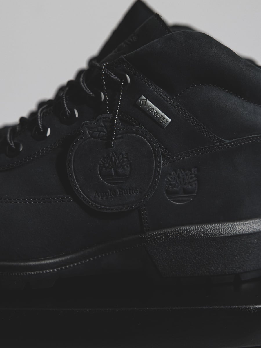 這雙 BEAMS x APPLE BUTTER STORE x Timberland 三方聯名鞋款鞋面採用黑色磨砂皮革,並以不同於一般「Field Boots」的鞋孔配置,以及去除不同布料拼接等細節調整,使整體保留粗獷氣質的同時,也呈現出更高級、俐落的精緻感。鞋墊印上三方品牌的標誌,而名牌吊飾則設計成「蘋果造型」,象徵此次三方聯名的獨特性。