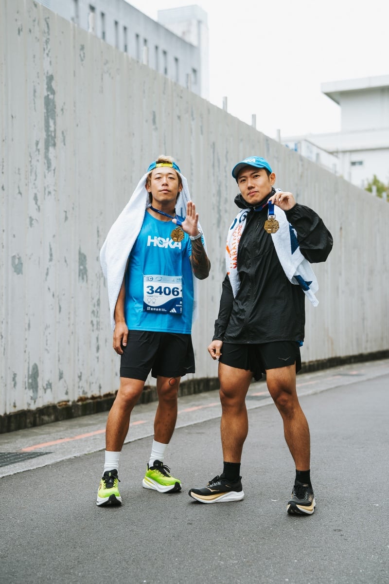 嘻哈團體玖壹壹成員洋蔥與健志,一路參與 HOKA 台北馬訓練營,並於今日順利完賽半程馬拉松,並雙雙突破個人最佳紀錄,分別跑出約 1 小時 50 分、2 小時 20 分賽事成績!對兩人來說,首次在台北馬 21K 賽道合體,挑戰的不只是距離,更激勵出人生賽道一起奔跑,一起飛得更高的能量,體驗 HOKA「Together We Fly Higher」的品牌精神。