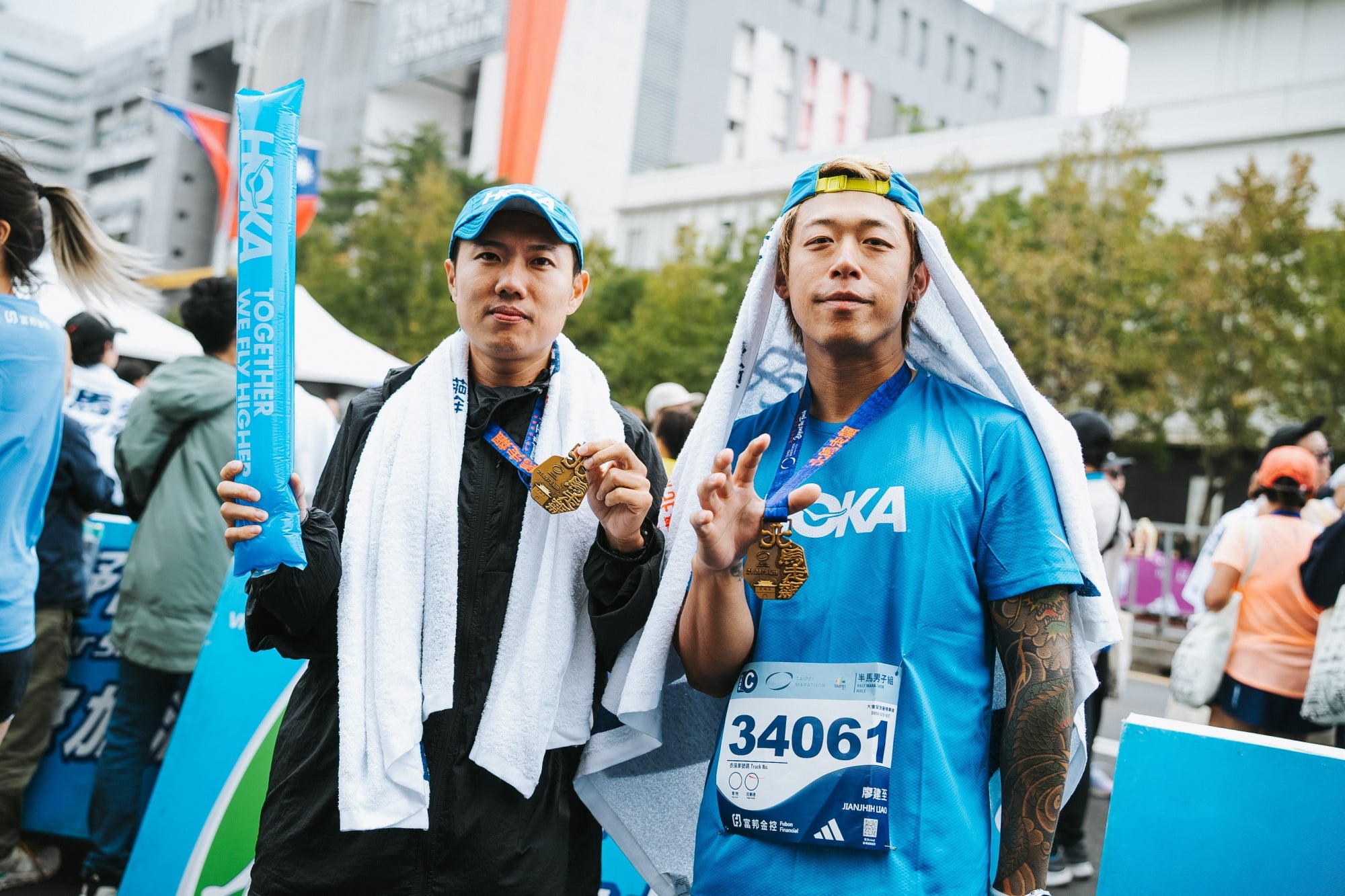嘻哈團體玖壹壹成員洋蔥與健志,一路參與 HOKA 台北馬訓練營,並於今日順利完賽半程馬拉松,並雙雙突破個人最佳紀錄,分別跑出約 1 小時 50 分、2 小時 20 分賽事成績!對兩人來說,首次在台北馬 21K賽道合體,挑戰的不只是距離,更激勵出人生賽道一起奔跑,一起飛得更高的能量,體驗 HOKA「Together We Fly Higher」的品牌精神!