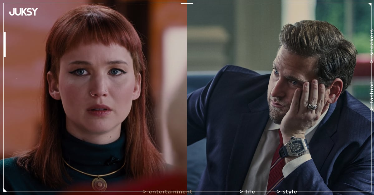 談起《千萬別抬頭》的拍攝過程,珍妮佛勞倫斯的第一個反應不是角色難度,而是「忍笑」的痛苦。她在訪談中形容,與喬納希爾對戲幾乎是一場耐力賽,只要一個不小心,就可能因為笑場而毀掉鏡頭。對於一部以諷刺為核心的黑色喜劇來說,現場氣氛比想像中更加失控。珍妮佛透露,喬納希爾的即興能力強到令人難以招架。劇組甚至安排整整一天,讓他自由發揮,對著她拋出各種臨時想到的嘲諷台詞。這些完全不在劇本裡的內容,往往來得又快又狠,讓她只能拼命咬牙撐住表情。她笑說,那一天雖然辛苦,但也是整部電影中最令人難忘的拍攝經驗之一。