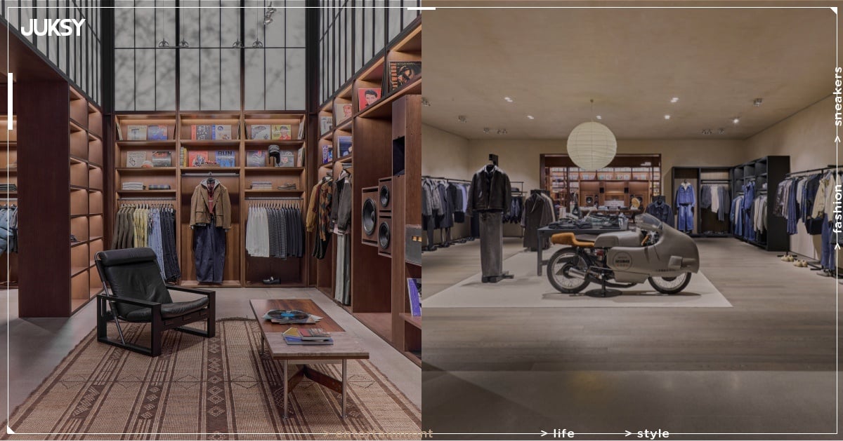 「ZARA MAN 心齋橋筋」由 ZARA 建築工作室操刀設計,外觀採用燒杉風格的深色木材搭配玻璃幕牆,呈現出沉穩內斂的質感,入口處特別設置了以片假名標示品牌名稱的行燈,巧妙融入日本傳統元素。店內以深色木質牆面與無縫混凝土地板構成開放式入口大廳,西班牙產石灰岩打造的雕塑感階梯優雅地連接兩層樓面,整體空間運用再詮釋的斯努克木材、明亮的灰泥牆面與日本灰木等材質,營造出層次豐富的視覺體驗。店內深處設有靈感源自日本障子的屏風,投射出細膩光影,搭配復古摩托車作為都會風格點綴,展現品牌對細節的講究。特別值得一提的是店內的「聆聽室」(Listening Room),由西班牙藝術家盧卡斯·穆尼奧斯(Lucas Muñoz)打造的訂製音響系統與黑膠唱片,讓顧客在購物之餘也能沉浸於音樂氛圍中,而面向吹拔空間的大型窗戶則以障子為設計靈感,映照出戶外樹影搖曳的詩意畫面。