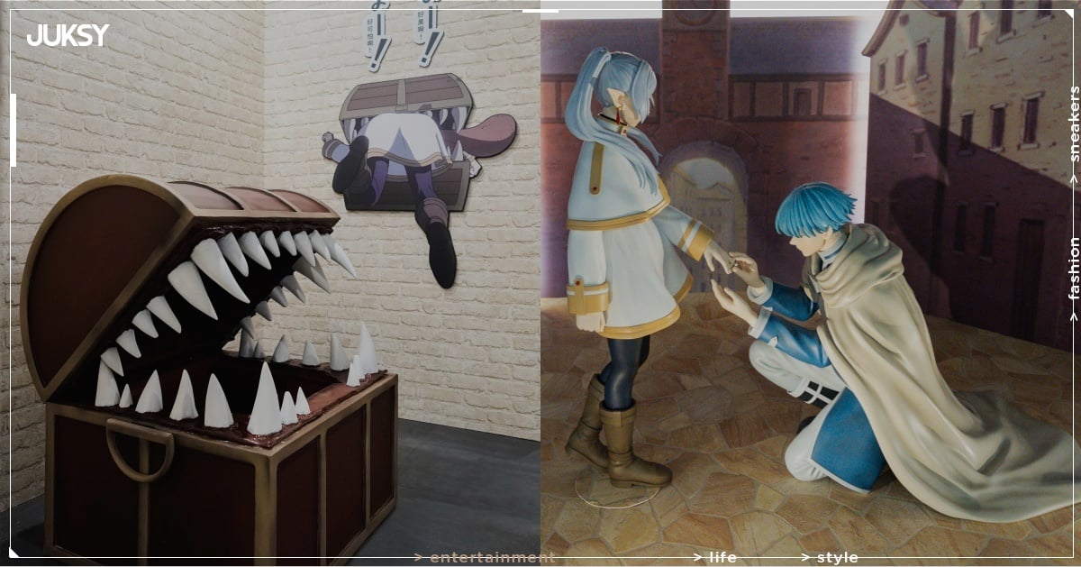 「序章」區以半世紀流星雨為靈感,展示芙莉蓮與昔日夥伴的故事,觀眾可在星光映照下重溫討伐魔王的旅程。「全新冒險的開始」介紹芙莉蓮與費倫、修塔爾克的新旅程,並設置勇者欣梅爾雕像拍照區,地面以蒼月草裝飾,增添故事感。「葬送的芙莉蓮」以芙莉蓮與阿烏拉的對決為主題,設置巨大的「服從的天平」,配合動畫影像中的攻擊畫面同步照明,聲光交織、臨場感十足。「僧侶與鏡蓮華」展示僧侶贊恩、武僧克拉福特及矮人戰士弗爾爺爺的故事,重現芙莉蓮從欣梅爾手中獲得鏡蓮華戒指 / 獲贈禮物的難忘時刻,吸引粉絲在此駐足拍照。「一級魔法使測驗」回顧芙莉蓮與費倫的考試挑戰,並設有「挑戰寶箱怪!」拍照區,親自體會芙莉蓮驚呼「好黑!好可怕!」的經典畫面。還有比照日本展覽特設的問答遊戲,挑戰觀眾的魔法知識,答對則可獲得限量角色明信片一張(7 款隨機發送)。