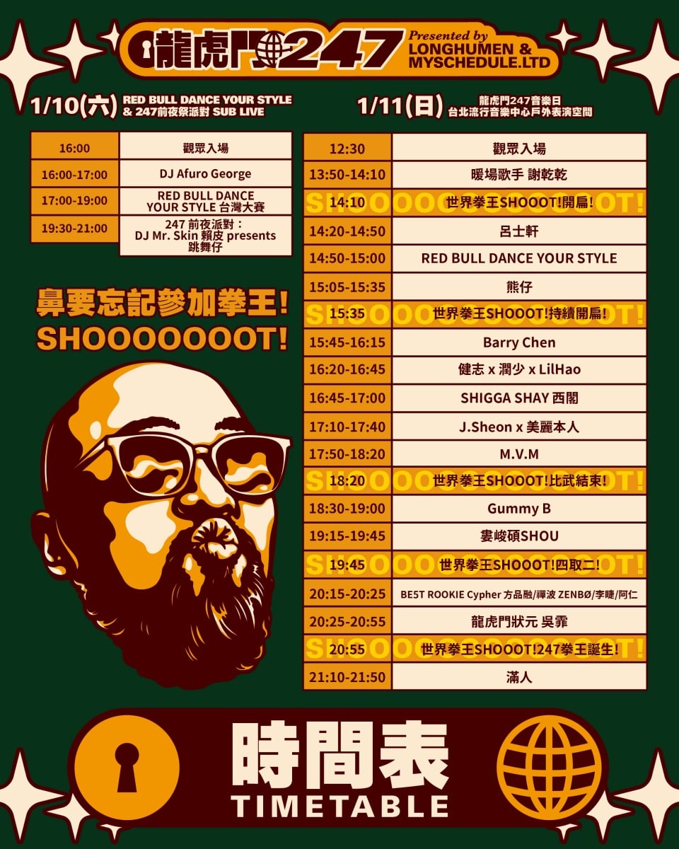 今年另有重要亮點——從「聲林之王2」節目崛起的吳霏,透過選拔誕生,從百名饒舌高手脫穎而出,獲 1,500 名網友投票,以及通過直播演出考驗,奪冠成為「龍虎門狀元」,將帶來他第一個完整 Full Set 嘻哈舞台演出,象徵新世代正式跨入頂級舞台。來自新加坡的 SHIGGA SHAY 西閣也將注入國際視野,本屆 247 將成為近年最具層次、最有故事性的嘻哈世代縮影。主辦單位喊話:「本屆《龍虎門247音樂日》的回歸,準備再次推開龍虎之門,讓音樂人與觀眾共同走向 24/7 的嘻哈人生。」
