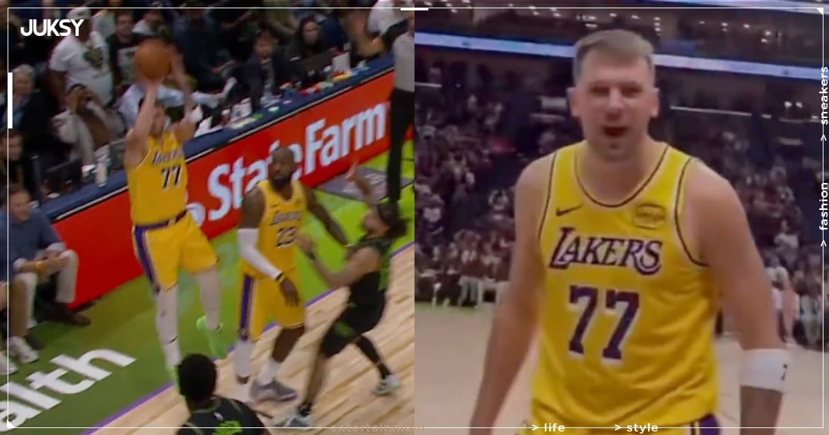 只見比賽進行至末節最後 2 分鐘膠著階段,湖人隊領先 6 分,在進攻秒數所剩不多的情況下,Luka Doncic 在三分線外右側 45 度角附近受到詹姆斯(LeBron James)的掩護後,在時間到點前高難度出手,最終成功把球給投進籃框,再次創造不可思議的場上魔法。