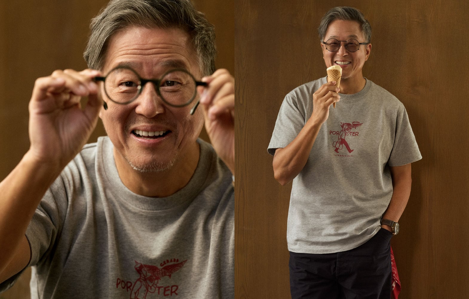 王偉忠身穿PORTER INTERNATIONAL × GERARD紅色圓領上衣,融入聯名識別,透過水洗與跳色手法,帶出紅色的柔和層次與復古韻味感;下身搭配軍綠純棉薄質面料的經典工裝褲,輕盈舒適透氣,直筒剪裁修飾身型,以釦式設計致敬男裝經典。他認為,真正的穿搭應讓生活順暢、不受拘束,在熟悉中延伸自己的心境。「就像人生的經驗會隨時間累積,而心境可以持續更新。」