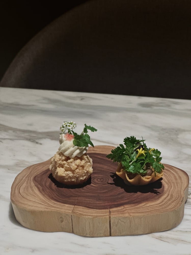 序曲的尾聲由兩道小品共同擺盤呈現,其一是以宜蘭豪野鴨為主體,將法國西南部鄉土料理中鴨肉與豆子燉煮的風味濃縮於小巧塔殼之中。搭配馬約蘭、紅紫蘇與山蘿蔔葉,風味濃郁卻不厚重,展現冬季料理深沉而內斂的底蘊。 最後與之呼應的是起源於布根地的「Gougère」,將乳酪揉入泡芙麵糰,內餡與慕斯皆特別選用白花椰菜製作,這是主廚在法國充滿回憶的冬季食材之一,因當年無法順利發音「花椰菜」的法文,多次請教法國同事的發音方式,藉此留下深刻溫暖的回憶。清甜與酸度相互平衡,為開胃序曲畫下鮮明清爽的句點。