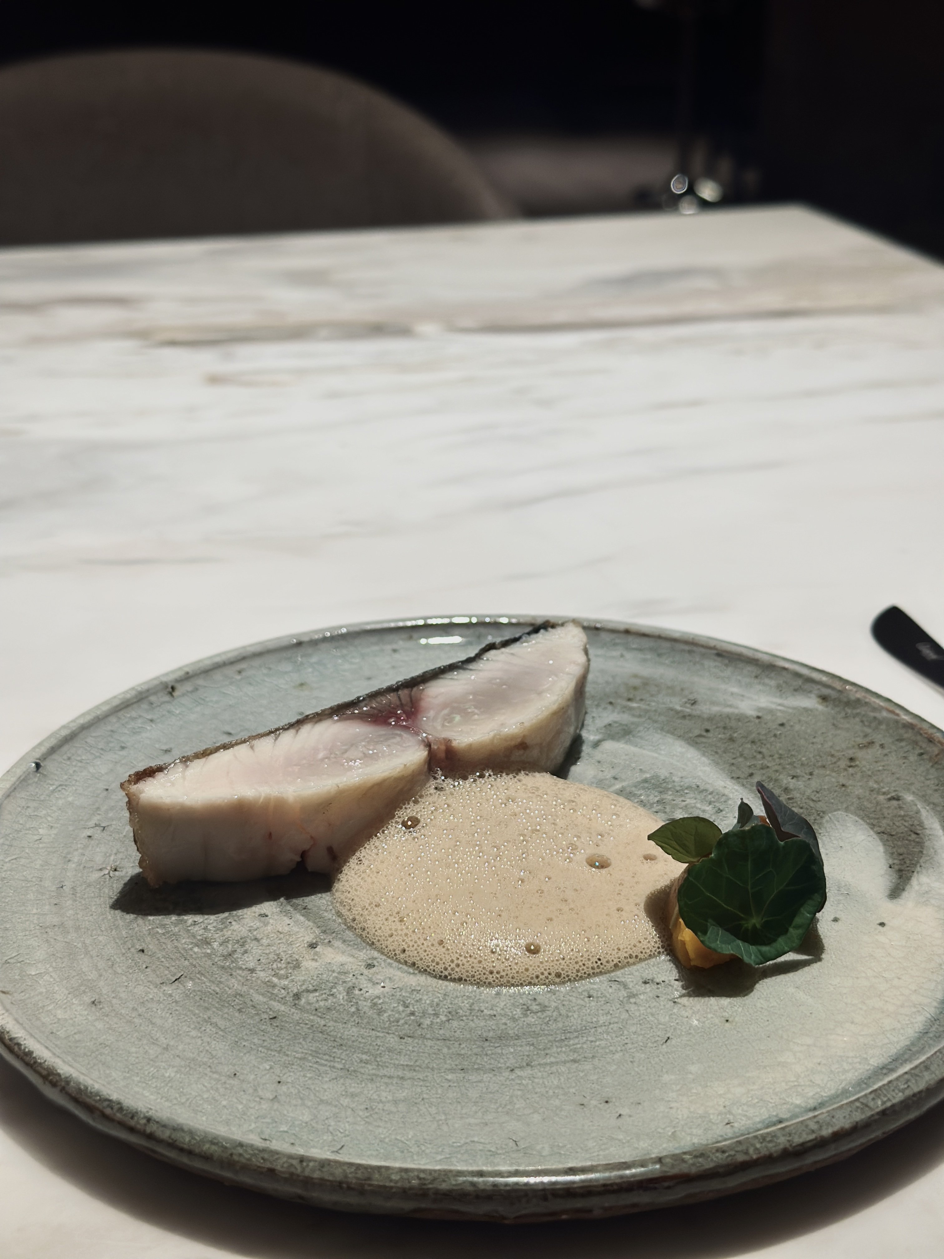 隨後登場的魚料理選用日本旬魚,其肉質細緻且富有彈性,搭配南瓜泥帶出的溫潤甜感,與雪莉酒和乾蔥熬製的輕盈酸香醬汁融合,讓這段冬季行進曲在進入主餐前,完成一次優雅而溫暖的收束。