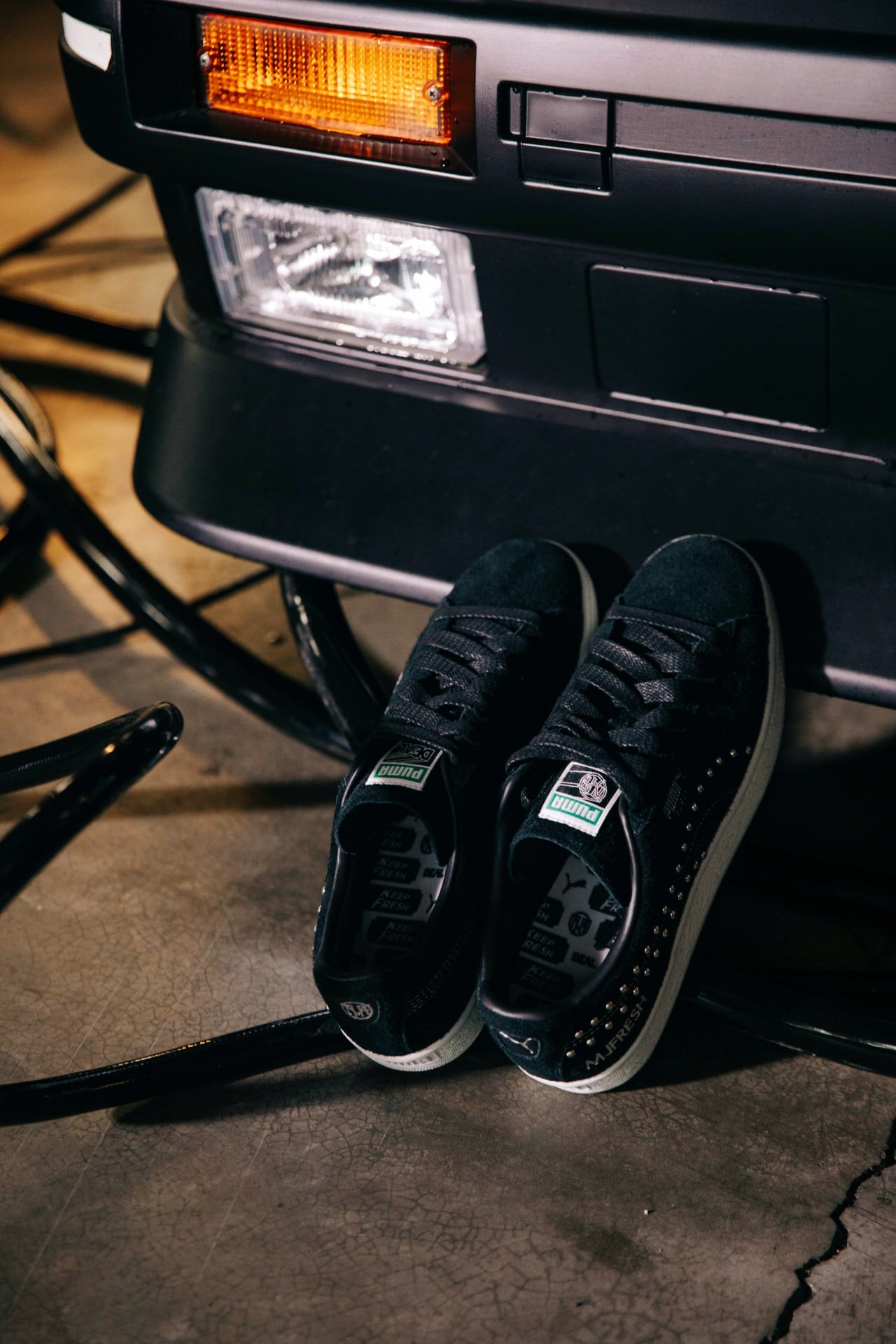 MJFRESH 由知名嘻哈團體頑童 MJ116 成員——瘦子 E.SO、小春 Kenzy、大淵 MUTA 共同創立,將品牌精神與音樂態度深植於街頭文化之中。DEAL lifestyle 作為指標潮鞋通路,則長期致力於球鞋文化的推廣與深耕。全新 PUMA × MJF × DEAL lifestyle 聯名鞋款,延續 SUEDE 鞋型在街頭文化與嘻哈圈的經典地位。設計靈感取自搖滾與嘻哈在精神層面上的相互呼應,將兩種音樂文化同源共生的核心概念,轉化為街頭時尚語言。鞋身採用深黑色麂皮材質,線條俐落流暢;鞋側彎刀以金屬鉚釘元素呈現,最後搭配燙銀品牌標誌,以低調配色展現內斂又有張力的視覺美學。