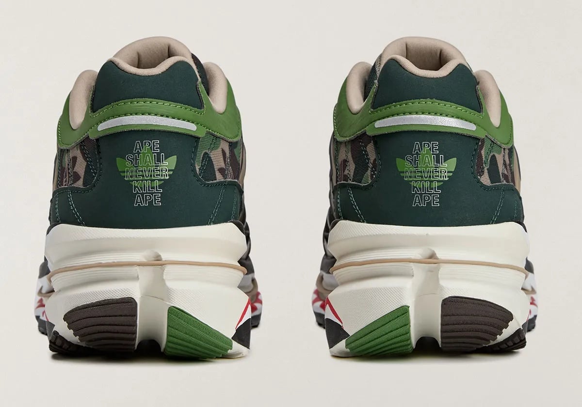 這次 BAPE x adidas 世界盃聯名系列中,最搶眼的莫過於 HRMY 鞋款,整雙鞋面覆蓋 BAPE 經典的 ABC 迷彩圖案,以深淺不一的綠色與棕褐色交織呈現,中底更加入品牌招牌的鯊魚咬痕圖騰,辨識度極高。