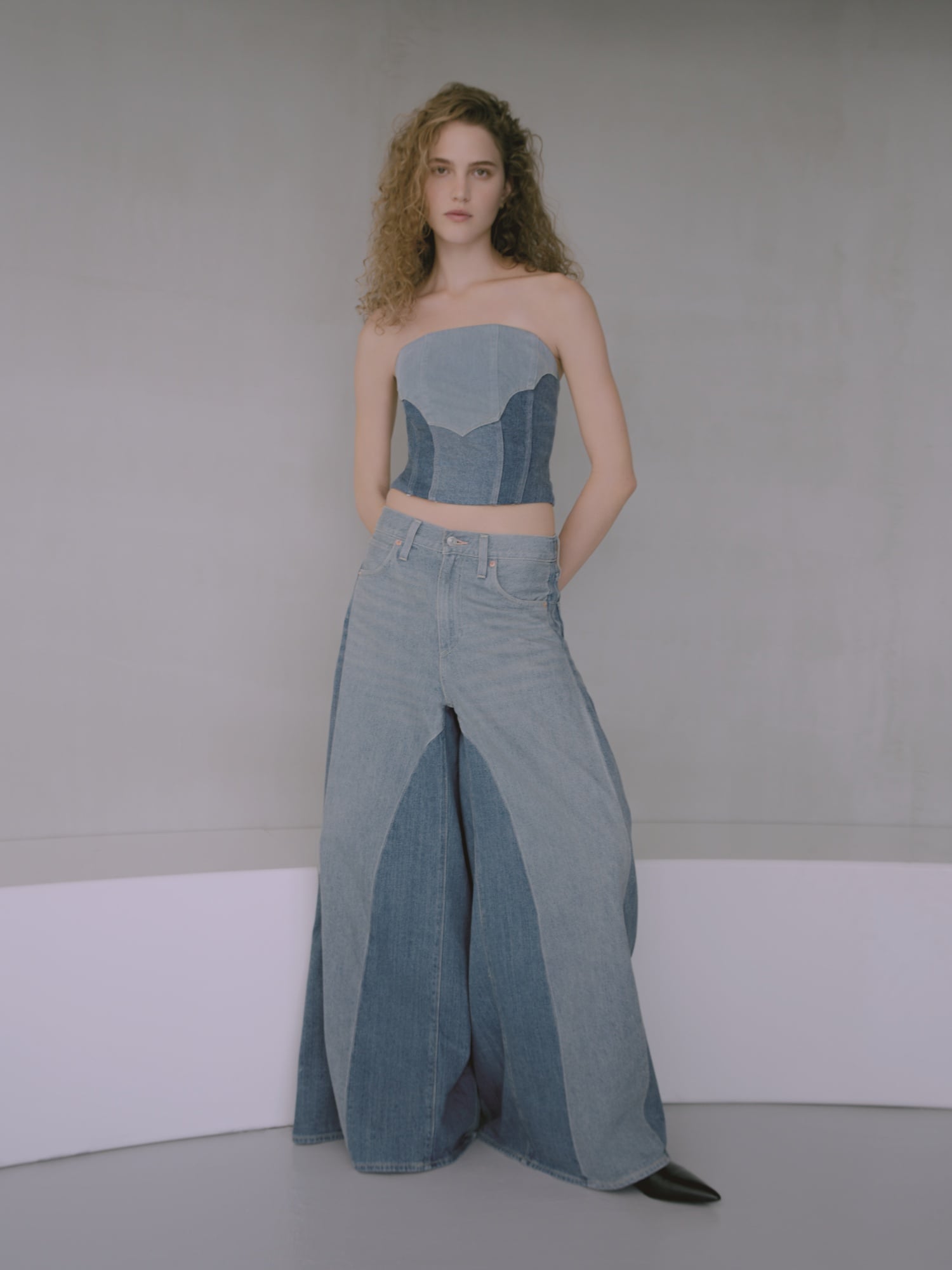 女裝單品以70年代 501® 丹寧褲揭開序幕,以經典七零年代輪廓為藍本,為當代消費者的著用習慣進行細緻改良,實屬本季度備受矚目的單品。寬版拼接解構丹寧褲以極具張力的線條展現大膽而從容的姿態,藉由細膩工序、異材質拼接與層層水洗的交錯鋪陳,織造出宛如「彩色鑲嵌玻璃」般流光轉換的湛藍美學。迷你版 Trucker 丹寧外套則以精巧的拼接展現細緻的縫製工藝。由輕盈透膚小方格布料製成的蝴蝶結襯衫,搭配抓皺與抽褶細節,為單品注入浪漫的女性氣息。極寬版水洗丹寧褲則以輕盈的天絲混紡丹寧,賦予寬鬆廓型更為流暢而柔美的垂墜感、呈現細膩從容的女性魅力;同樣的布料也應用於經典的 Type II 丹寧夾克外套。最後,由細緻蕾絲短袖襯衫單品,結合柔滑棉料配以蕾絲邊飾,為女裝陣容畫下優雅收尾。
