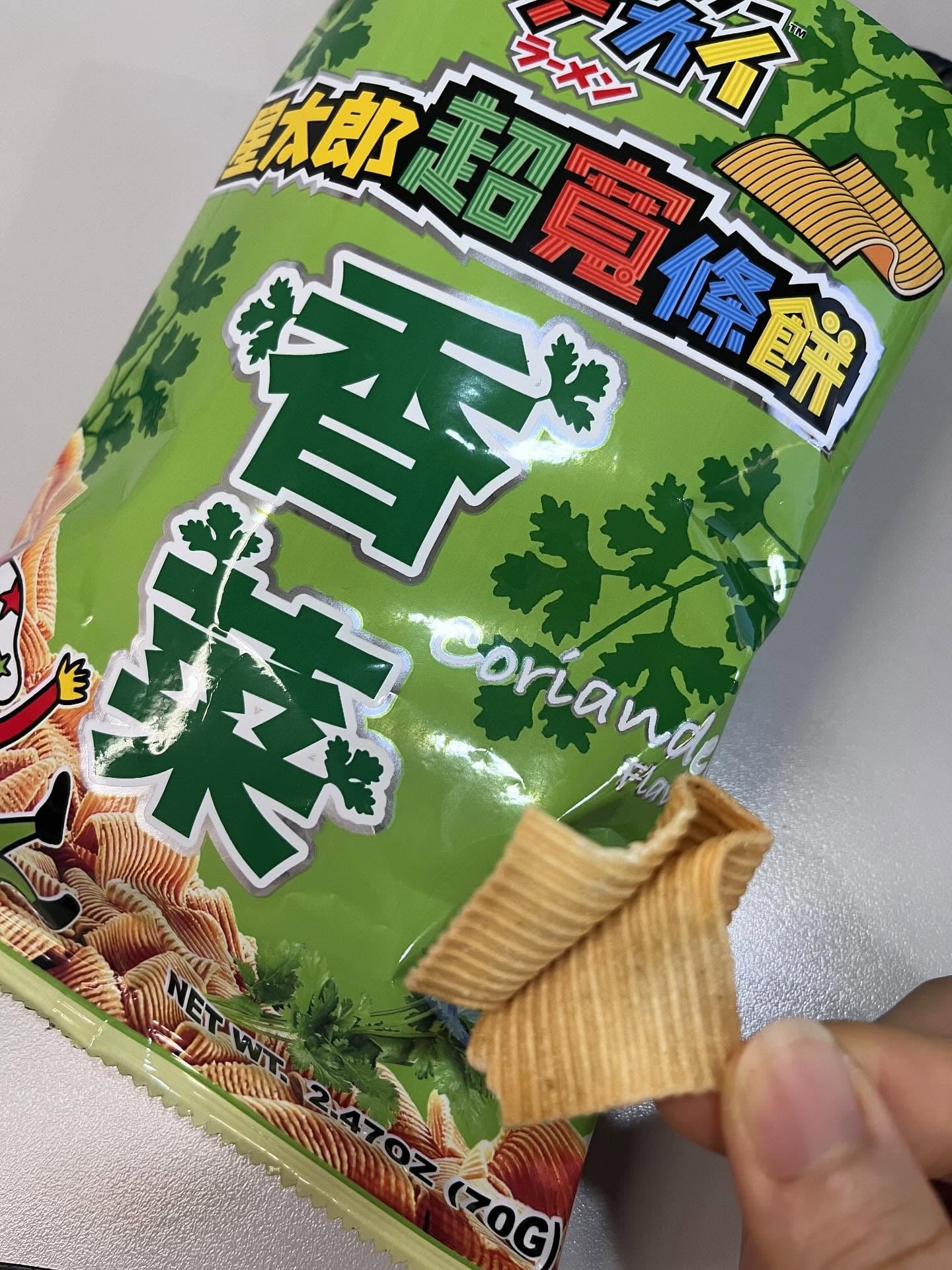 星太郎超寬條餅 香菜口味是以超寬麵條造型打造的脆口點心,直接把香菜清爽香氣和濃厚調味一次融合,每一口都是酥脆到不行的爽感,咬下去還能感受到麵條獨有的紮實口感,越吃越涮嘴,它不只香菜味夠有存在感,還搭配洋蔥、蒜頭等風味香料,層次感超豐富,讓香菜清香在嘴裡慢慢擴散,香而不膩。台灣生產、話題特殊口味,完全是香菜控必收的邪惡零食代表!