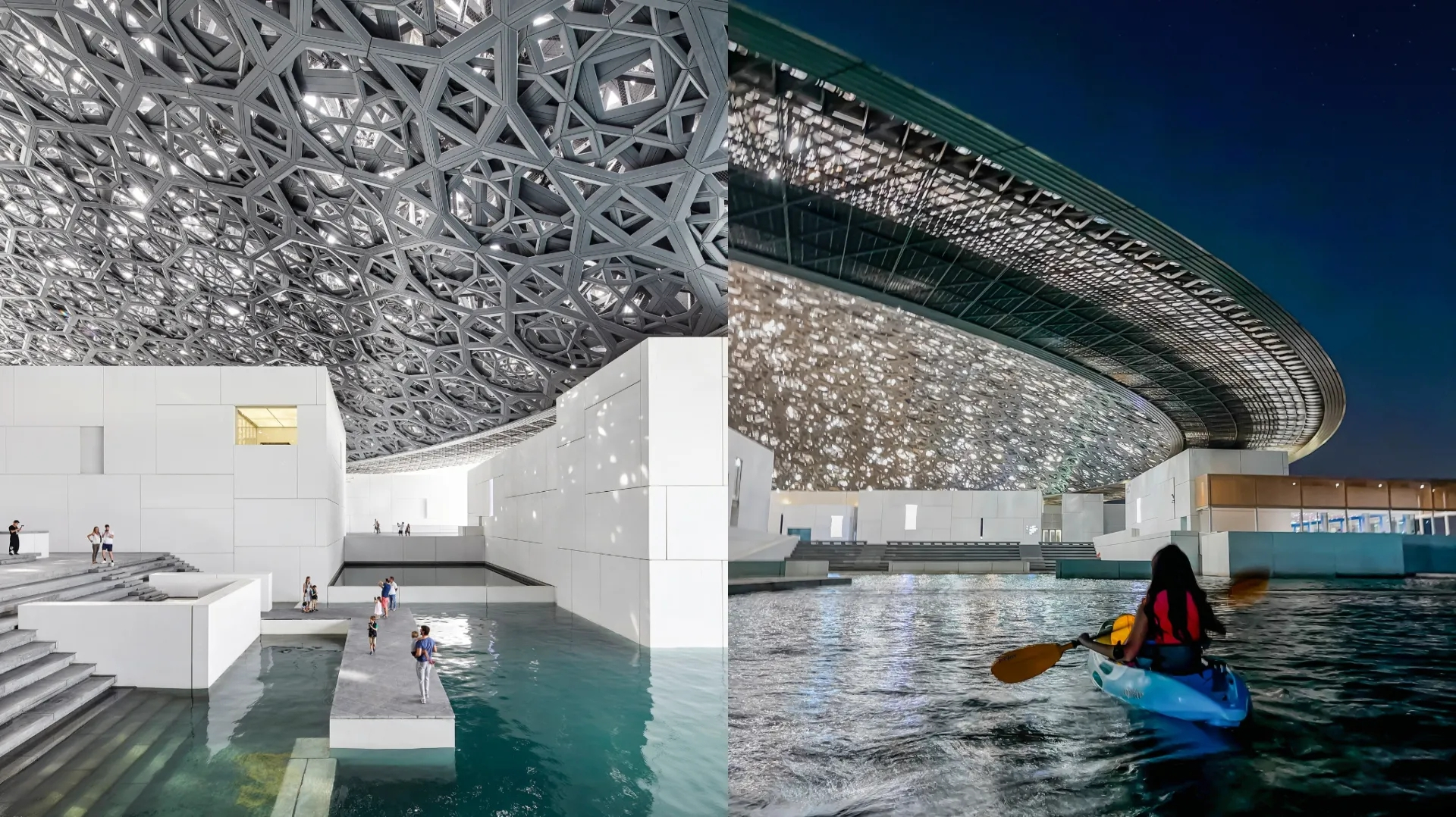 阿布達比羅浮宮(Louvre Abu Dhabi)不僅是法國羅浮宮在海外的唯一分館,更被譽為「海上羅浮宮」。由普立茲克獎得主尚·努維爾(Jean Nouvel)設計,這座博物館宛如一座漂浮在波斯灣上的白色群島。最令人屏息的是那直徑 180 公尺的銀色穹頂,由 7,850 顆幾何星形交織而成。當陽光穿透穹頂灑落,館內會出現如電影場景般的「光之雨」,靈感來自沙漠綠洲中棗椰樹葉的搖曳光影,每一秒的畫面都唯美得不可思議。這裡不只是看畫,更是一種「心靈療癒」。作為阿拉伯世界首座「全球性博物館」,策展打破了地域限制,將同時期的東西方藝術並列,講述人類共通的故事。除了靜態觀展,這裡最酷的體驗莫過於「海上皮划艇」以及「電動雙體船」!你可以預約行程,乘著船繞行這座海上宮殿,從水面視角欣賞建築與光影的流動。曾造訪的網友皆給予高度評價,帶動聲量穩定上升:「經典白與海藍綠一色搭配起潮流時尚的整體感,很適合旅客前來朝聖打卡拍照留念」、「不管看不看展,只看建築也完全值得來參觀」、「建築設計相當漂亮的博物館,值得一逛。來 UAE 旅遊的必訪景點之一」。