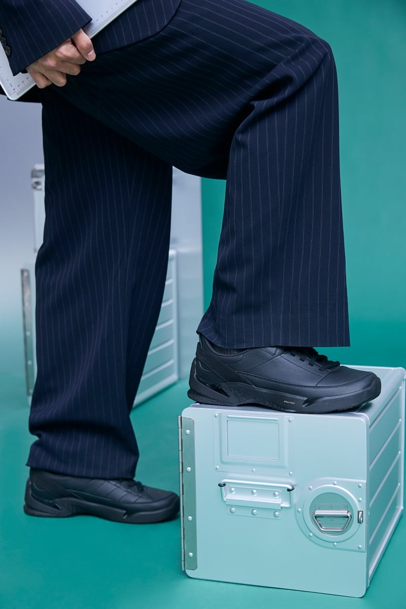 鞋面設計延續量體裁衣般的結構思維,透過 45 度鞋頭剪裁與貼合足型的曲線設計,降低摩擦壓力;結合穩固後跟帶與飛線眼扣細節,在支撐與靈活之間取得完美平衡。