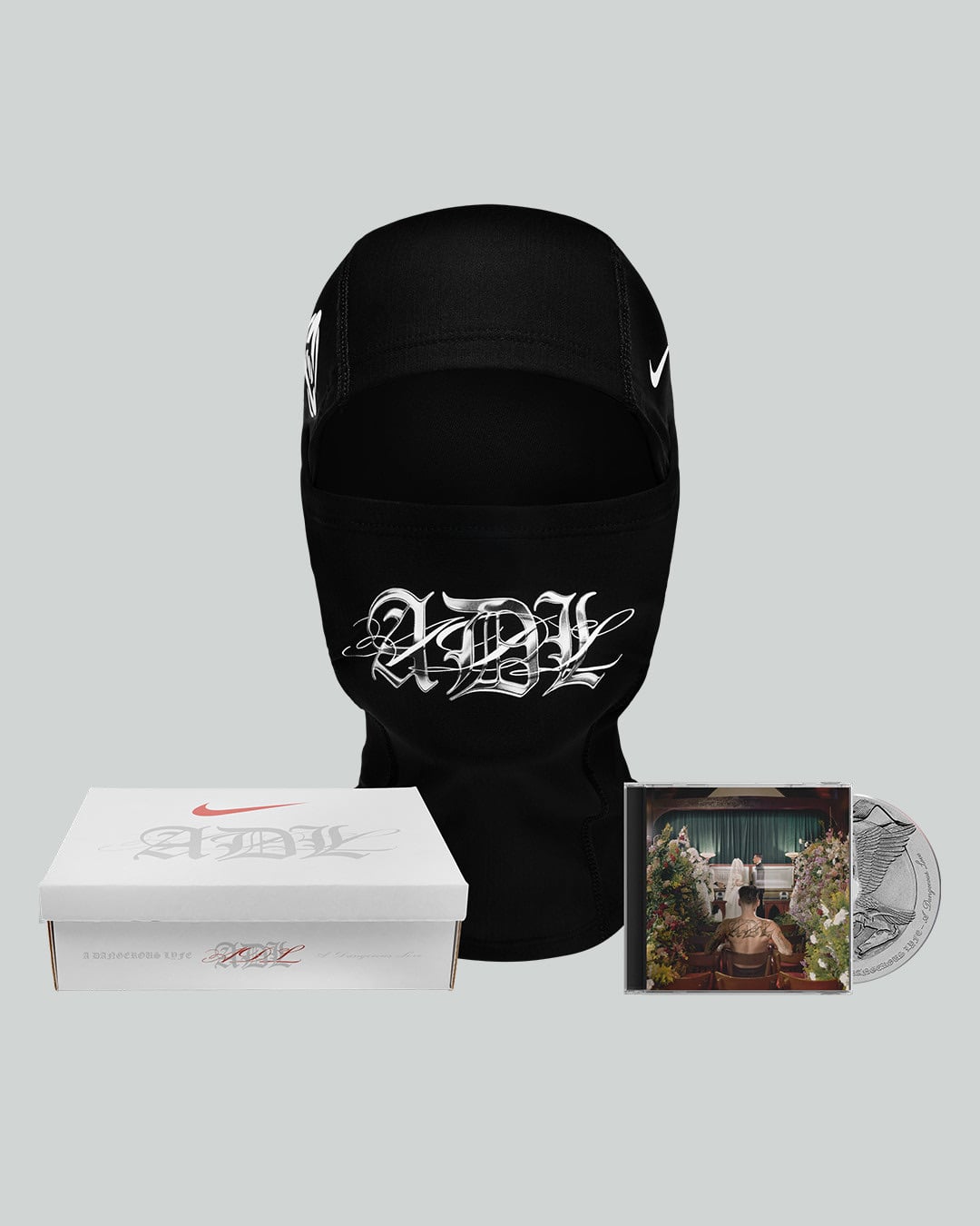 《ADL》代表「A Dangerous Lyfe / A Dangerous Love」的雙專輯概念,是 Yeat 近年最重要的音樂計畫。為了讓整體企劃更具完整世界觀,他與 Nike 這次不只是推出一般的藝人周邊,而是將品牌視覺與專輯敘事深度結合,打造出完整的「Nike x ADL」聯名商品系列。整個系列以收藏型套裝(Box Set)為核心,內容涵蓋多款 CD 版本、黑膠唱片與服裝單品,並以類別似 Nike 經典鞋盒的外盒設計作為包裝概念,讓整體產品更像是一件潮流收藏品,而非單純的音樂載體。