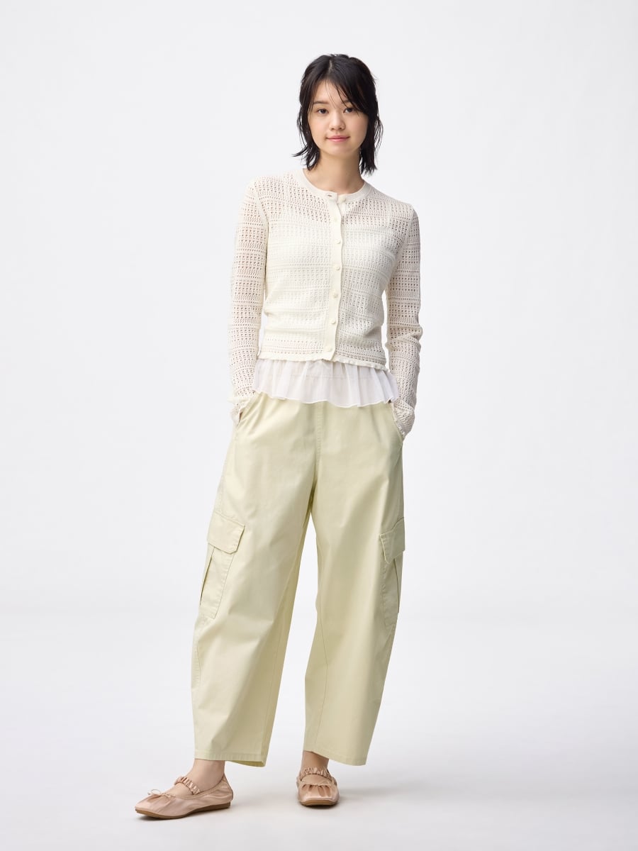 本季 Barrel Ankle 系列延伸出多種風格版本,其中以「輕型牛仔錐形褲」最具代表性。透過輕磅丹寧重新詮釋經典輪廓,在保留立體線條的同時降低厚重感,讓整體更符合春夏氣候。而「輕便錐形褲」則以柔軟材質強調自然垂墜感,降低造型門檻,使錐形褲不再只是潮流單品,而是可以融入日常的基本款。另一方面,「工作錐形褲」則透過工裝口袋與結構細節,強化整體存在感,讓褲子本身成為造型重點。透過不同材質與設計語言的轉換,GU 也讓同一個錐形輪廓,發展出多元風格可能,從法式學院風到城市波希米亞風,都能自由切換。