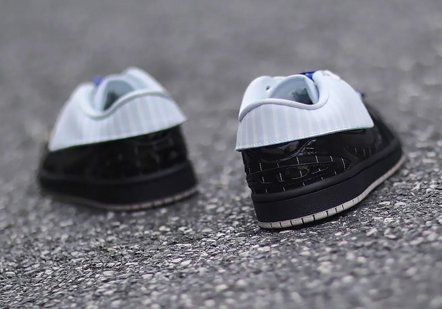 從網路上率先曝光的照片可以看到,這雙 Air Jordan 1 Low Method of Make v3「Suit and Tie」鞋面以亮澤黑色漆皮為主體,搭配黑色細條紋布料,呈現出西裝外套的質感。最吸睛的部分在於鞋舌與鞋領位置——傳統設計被替換成一片淡藍色折疊細條紋襯衫衣領,衣領中央還縫有一顆一體成型的鈕扣;鞋帶扣則採用波點圖案設計,模仿領帶造型,而鞋身上更點綴一枚鍍金 Jumpman 徽章,為其增添奢華感,下方則以米灰色的外底低調收尾。整體來看,真的就像是一雙「穿著西裝的球鞋」。