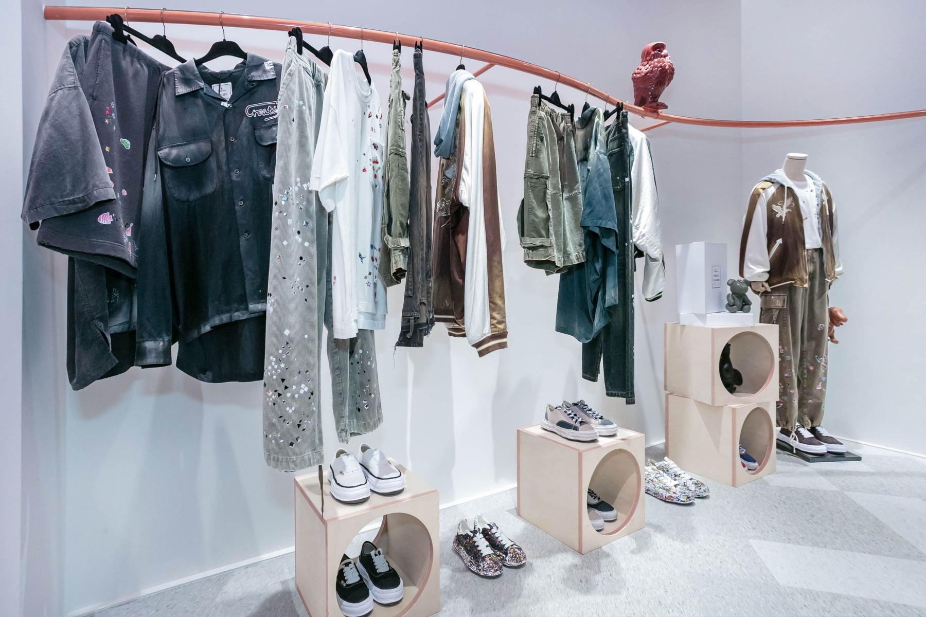 空間設計方面,現場裝置以自然紋理材質為主軸,搭配鏤空 L 型結構與破壞牆元素,形塑具有穿透感的展示語境,直接呼應「溶解鞋」源自紙黏土的設計概念。信義遠百 A13 店鋪特有的巨型貓頭鷹裝置也隨之換裝,披上一襲丹寧拼接外衣,致敬 MMY 品牌的解構主義脈絡,讓整個空間本身成為策展的一部分。網友與時尚愛好者對此次策展反應熱烈,尤其是限定鞋款的獨家引進,讓不少收藏迷早已摩拳擦掌。