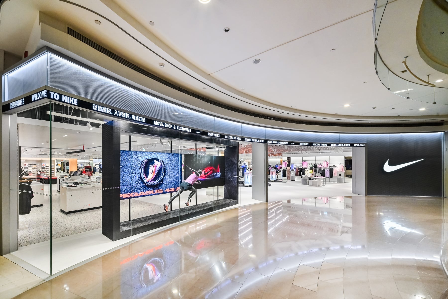 Nike 臺北品牌體驗店作為都市運動基地,整體空間設計則以簡潔有力的視覺語言貫穿,以經典 Nike Swoosh 標誌作為核心元素,搭配明亮且層次分明的燈光設計,透過燈光隨季節商品主題變化,營造出充滿律動的運動體驗,讓每一個角落都流動著屬於臺北的運動能量。消費者服務區則透過運動故事與菁英運動員影像,傳遞 Nike 以運動員為核心的品牌精神,打造結合產品、文化與體驗的完整空間。