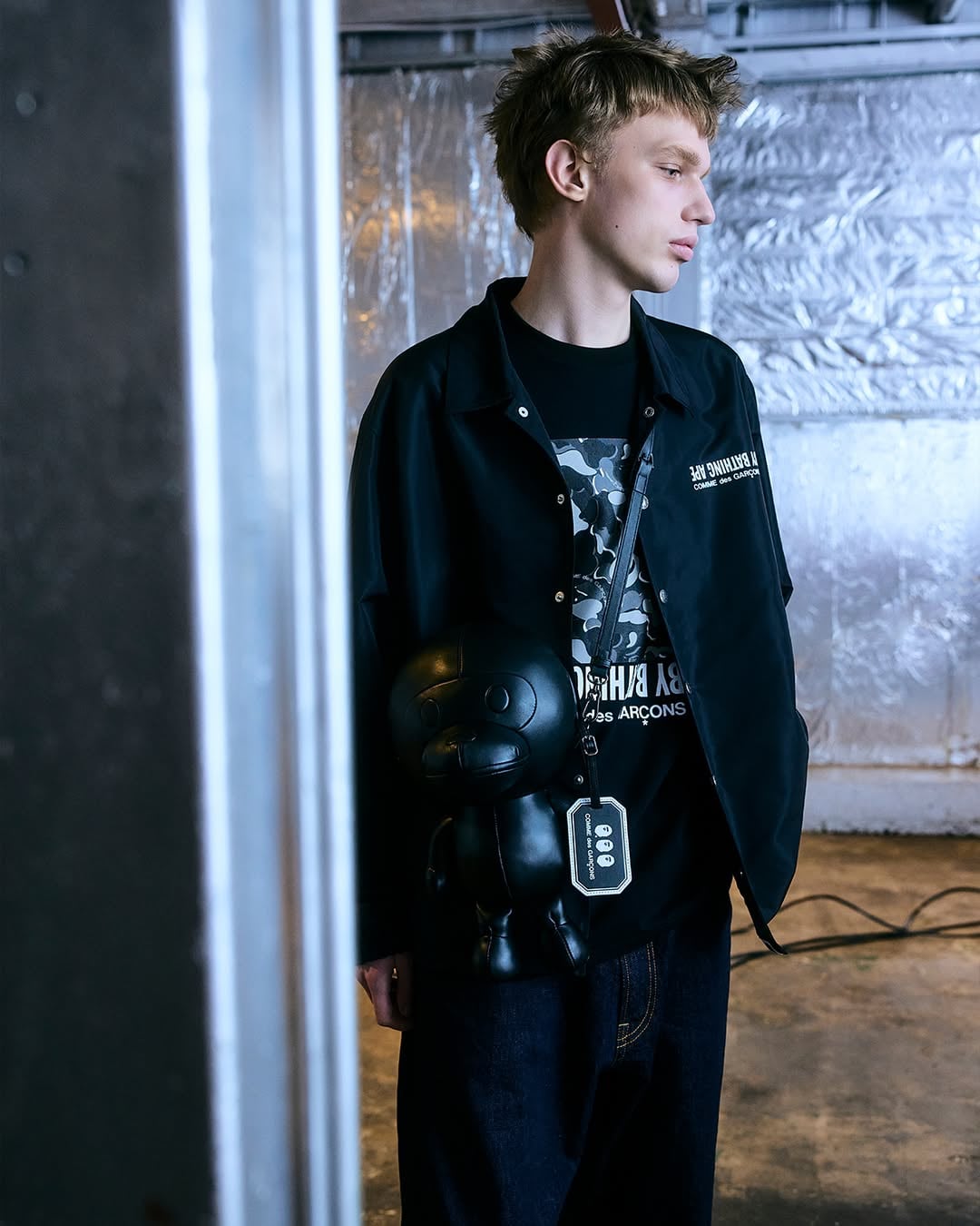 在圖像運用上,BAPE® 三大標誌性符號——APE HEAD、BABY MILO®、BAPE® CAMO 迷彩都全數登場,並與 CDG 的視覺語言交織重組,創造出兩個品牌碰撞後的全新視覺敘事。整體配色以黑白單色為基底,再點綴亮黃與寶藍作為跳色,視覺上既保留 CDG 一貫的冷冽極簡氣質,又融入 BAPE® 街頭基因該有的張揚感,兩者之間的張力拿捏得相當精準。