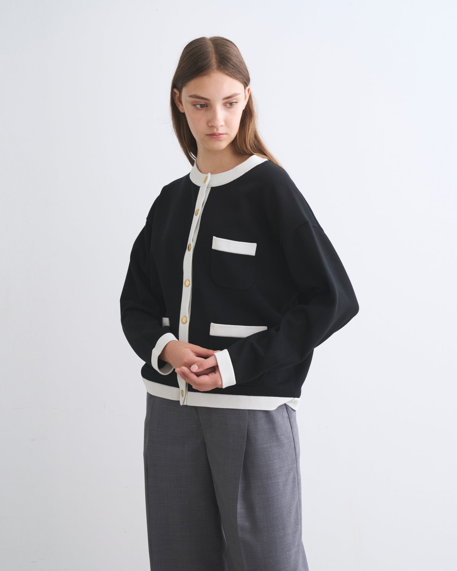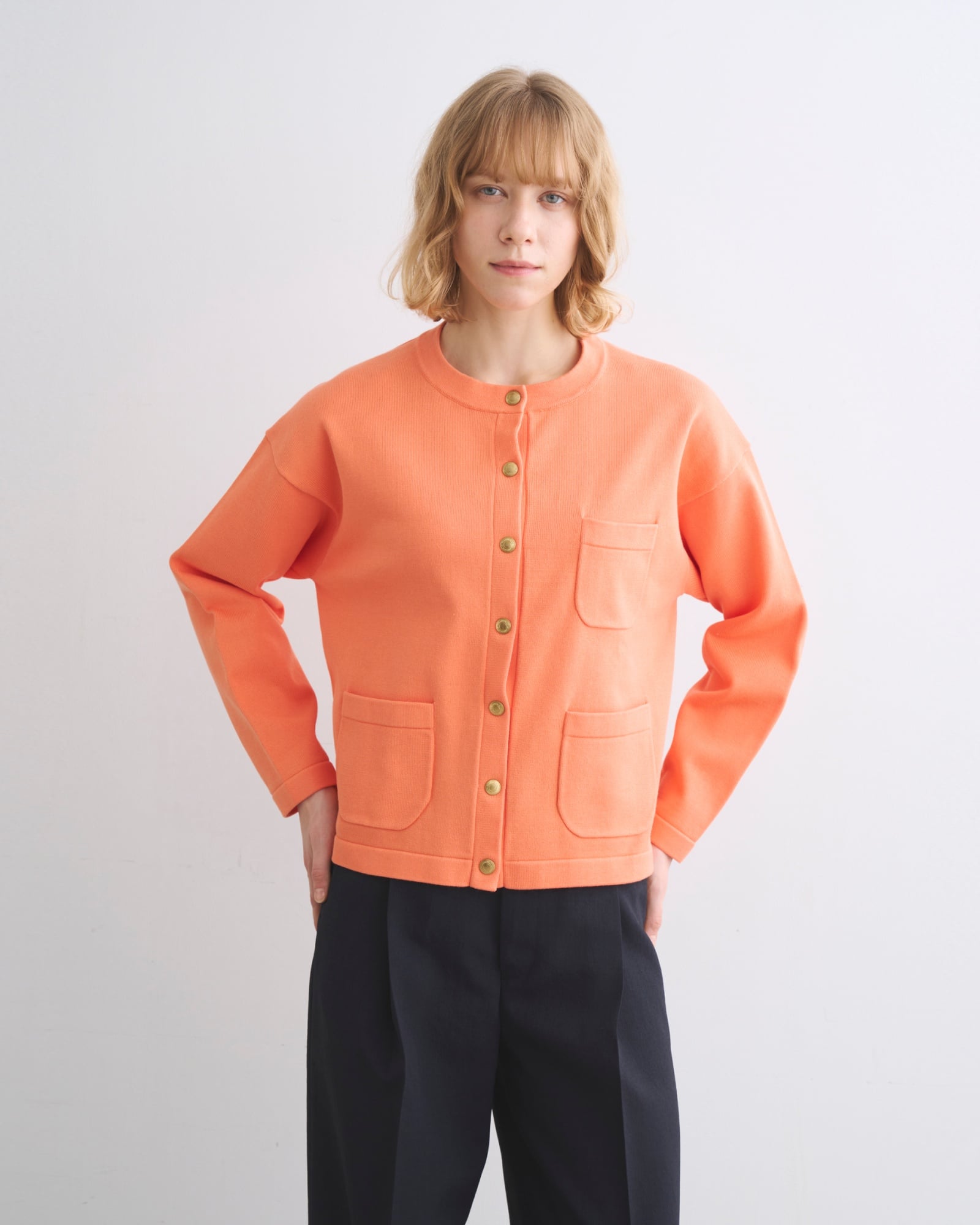 品牌經典熱銷的圓領外套,以高密度編織技術賦予面料優異的挺拔廓形,同時保有針織特有的舒適穿感。俐落的箱型剪裁搭配標誌性金色鈕扣,散發精緻知性的英倫氣質;乾爽且四季皆宜的面料特性,也讓它成為可在正式與日常之間靈活切換的實穿單品。