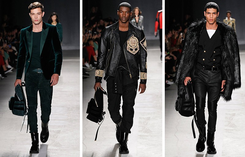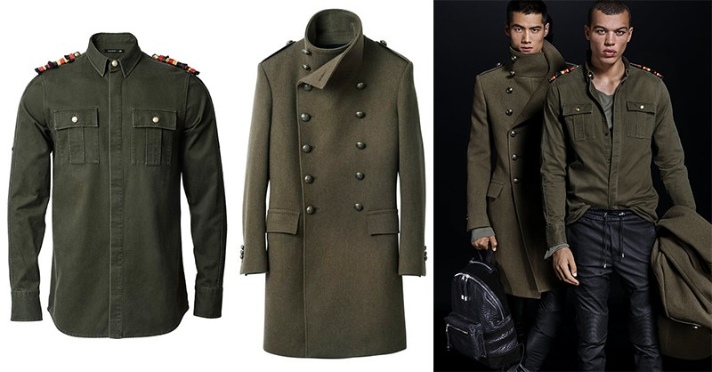 男裝部分基本上每一個款式都包含有一件軍裝風格單品,當然這也在我們的預料之中,畢竟但凡提及 BALMAIN 就必然會講到軍裝。我挑出了其中的一件襯衫和大衣,兩者都以軍綠色示人,並裝飾有肩章,襯衫的肩章還頗有些獨特。大衣的高領設計是冬天保暖又有型的選擇,五組雙排扣加上領子和肩部共 14 顆銅紐扣突顯硬朗的氣質。