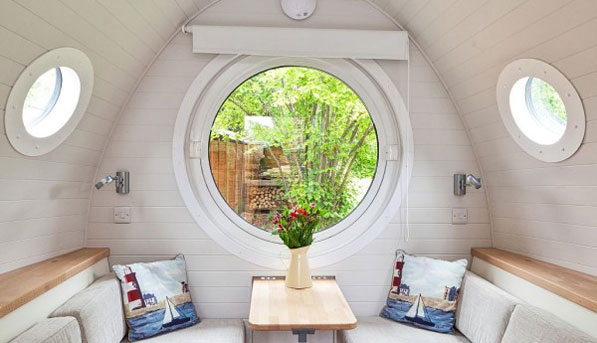 就一輛精巧且現代感的托車車廂停放在英式花園裡。它不是裝飾品,而是認真可以提供給人住宿的豪華拖車車廂。