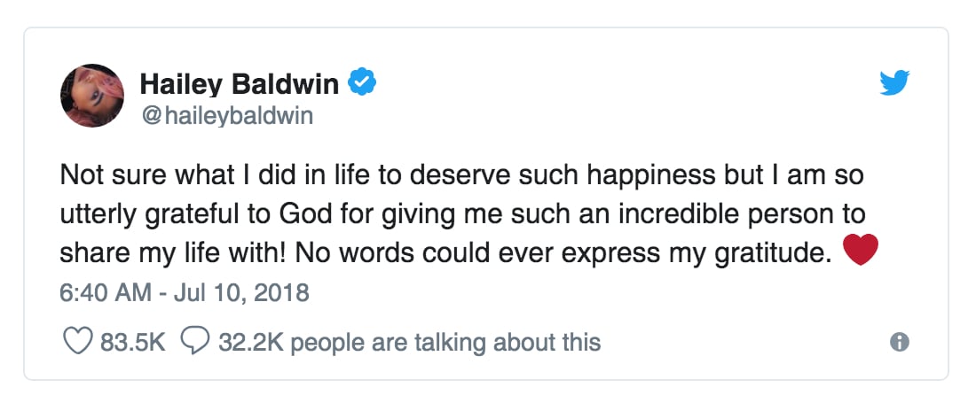 ▼海莉·鮑德溫(Hailey Baldwin)繼小賈(Justin Bieber)的浪漫發言後,自己也接力在推特上浪漫發言、超閃:不知道我在生活中做了什麼值得得到這樣的幸福,非常感謝上帝給了我這樣一個不可思議的人與我分享生命!沒有言語能表達我目前的感激之情。