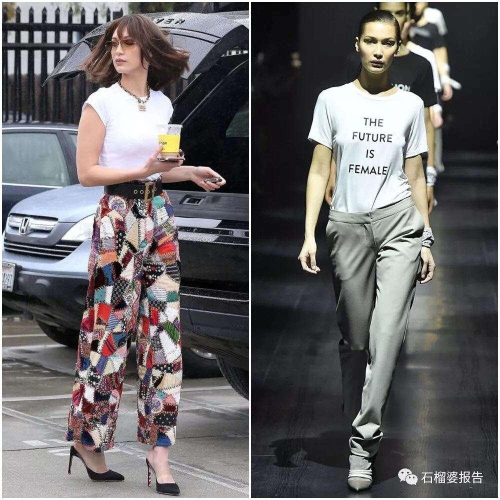 所以飛袖真的誤導人,左圖是 Bella Hadid 近照,讓人以為她胖了不少。換上右圖的 Prabal Gurung 白 tee,到上臂一半長度的短袖,這才恢復了模特身材。
