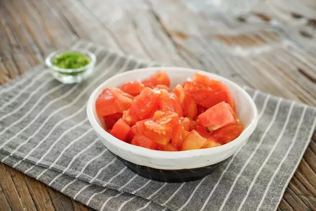 3、番茄過熱水,去皮,切小塊,裝盤備用。