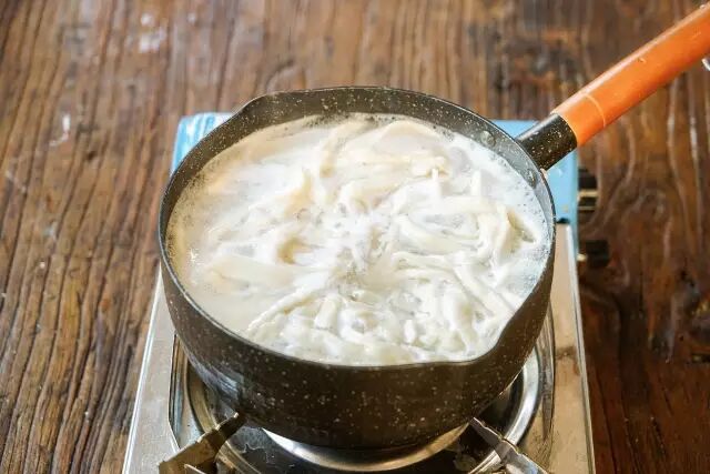 6、清水煮手擀麵,沸騰後加少量冷水,重複三次,完成後撈出濾水,裝碗。