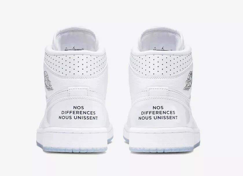 鞋款以白色為主打,鞋頭,鞋幫,鞋底以及鞋墊則以黑色波點點綴,搭配金色細節和冰藍色大底,讓整體設計不再無聊。此外,後跟處醒目的「Nos Differences Nous Unissent」標語表達了「求同存異」的主題,讓鞋款更具意義。