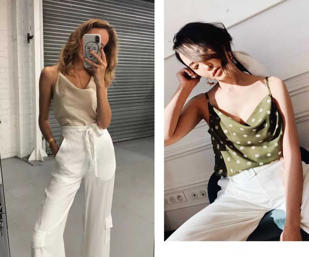 如果你是屬於上半身瘦,但是下半身胖的梨形身材,我真的太羨慕你了~因為今年大部分時髦單品都屬於你。像是絲質吊帶和長褲的組合。既有一點性感,又不是太 over 。一些露肩露腹的緊身小上衣,出去度假的時候還沒有一件嗎?