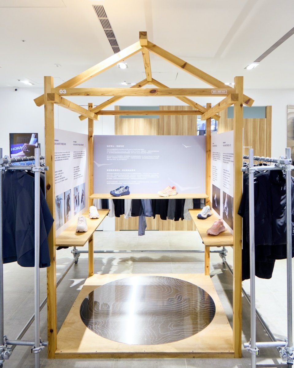 - 伸展台重現區:重現臺北時裝週《INTERLACE|交錯場》的服裝造型與現場氛圍。人台展示 oqLiq 同款秀服搭配 HOKA Mafate Lifestyle 鞋履,牆面輸出秀場影像與幕後花絮,電子螢幕循環播放走秀片段,讓觀者重返山林與都會交錯的伸展台節奏。