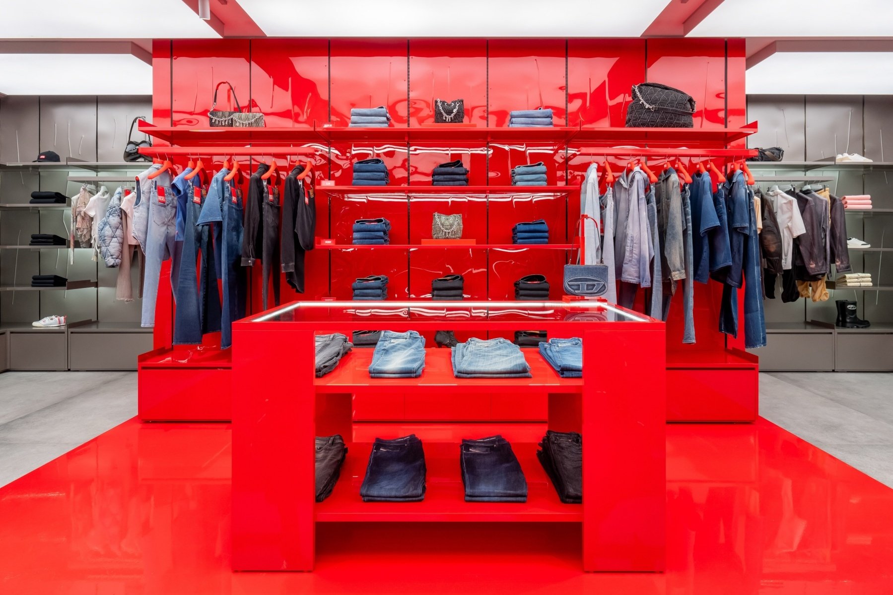 全新空間以標誌性的紅色搭配冷冽金屬材質,營造鮮明卻和諧的視覺張力。鏡面質感與大膽色彩交織出強烈衝突美學,呼應 Diesel 「突破常規」的品牌理念,讓每位踏入其中的消費者都能感受到前衛與個性的碰撞。整體設計俐落純粹,將焦點回歸商品本身,打造兼具藝術感與實用性的購物氛圍。