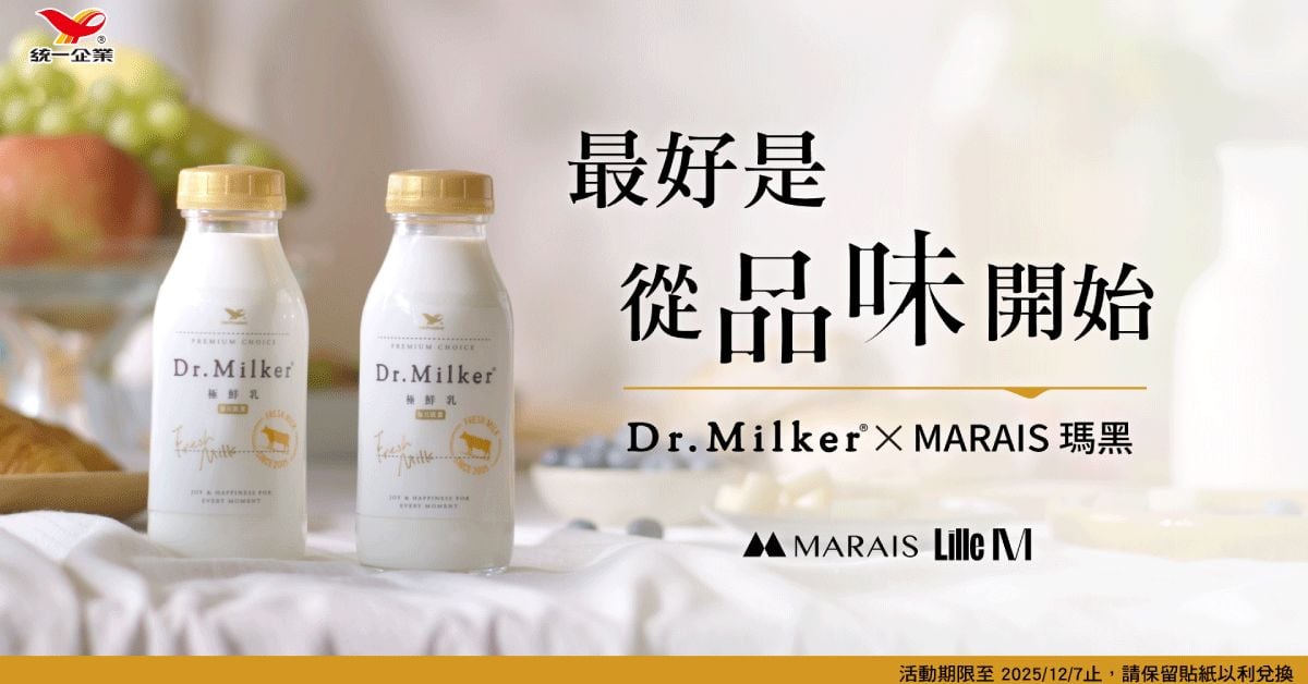當鮮乳中的精品 Dr.Milker,遇上質感生活品牌MARAIS瑪黑,兩個同樣講究細節與風格的品牌,攜手打造一場以「品味」為名的限時合作企劃。即日起至 12 月 7 日止,凡於全國7-Eleven購買 Dr.Milker 極鮮乳,即可憑瓶身貼紙兌換MARAIS瑪黑旗下品牌的專屬優惠,一起在日常裡體驗「最好是 從品味開始」的生活提案。